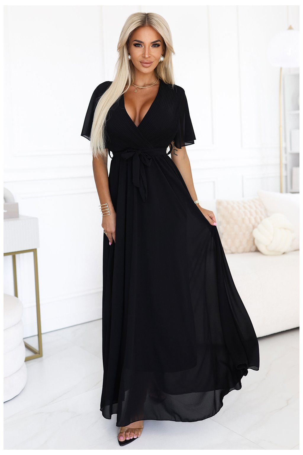 Elegantní a ženské maxi šaty v klasické černé barvě jsou ideální volbou pro speciální příležitosti. Horní část je efektně dokončena zástěrkovým výstřihem, který jemně zdůrazňuje poprsí a dodává siluetě lehkost. Volné, vzdušné rukávy se krásně skládají na ramenou a šněrování v pasu umožňuje perfektní přizpůsobení a zdůraznění ženských tvarů. Spodní část šatů vyrobena z lehkého šifonu nádherně vlní v pohybu, vytvářejíc elegantní, romantický efekt. Je to skvělá volba na svatbu, oslavu, Silvestra, slavnostní večeři nebo jiné speciální události. Produkt evropské značky Numoco Basic je vyroben z vysoce kvalitních materiálů, které zajišťují pohodlné nošení a stylový vzhled. Očarujte klasikou a objednejte si své ideální šaty ještě dnes!