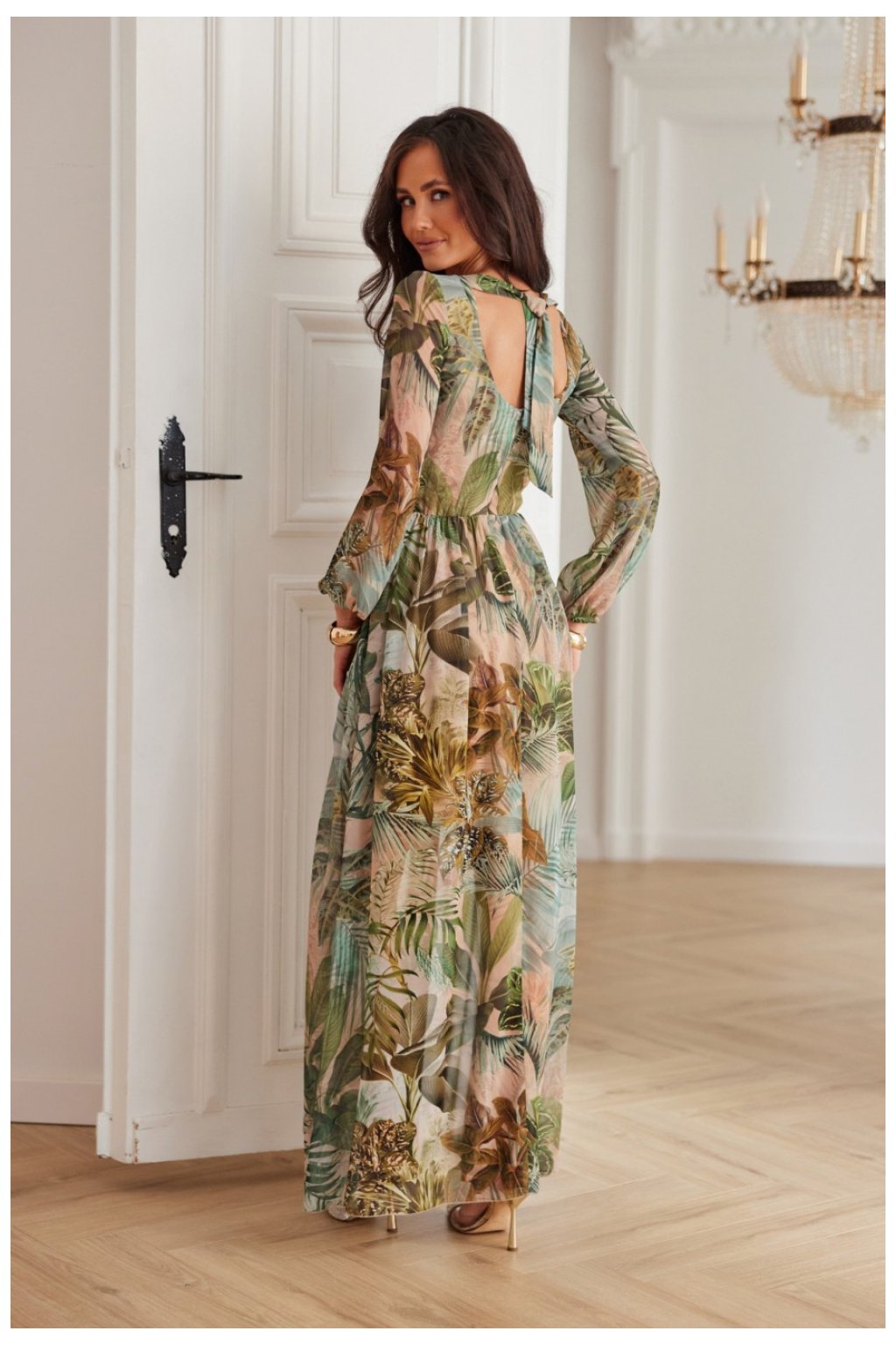 Maxi šaty Alessia spojují stylový design s výjimečným pohodlím. Jejich volný střih a vzorovaná, šifonová látka dodávají celku lehkost a subtilní eleganci. Délka ke zemi, vždy aktuální, dělá tento model elegantním bez ohledu na příležitost. Klopýtnutý výstřih jemně zdůrazňuje krk, a rozpark zepředu opticky zúží siluetu. Dlouhé objemné rukávy a smyslný výstřih na zádech s vázáním a skrytým zipem dodávají celku rafinovaný charakter. Novým prvkem v tomto modelu je elastická guma vsazena na zádech, která zajišťuje lepší přizpůsobení postavě a krásně zvýrazňuje pas. Tento praktický detail zvyšuje pohodlí nošení, aniž by se zříkali estetiky. Dodatečná podšívka z lehké látky brání průsvitnosti a zajišťuje, že látka se elegantně skládá. Šaty jsou k dispozici v barevné škále inspirované nejnovějšími trendy podzimní sezóny. Pečlivě vybrané barvy zdůrazňují jedinečný styl modelu, umožňují snadné sladění jak s elegantními, tak s každodenními doplňky. Jedná se o ideální návrh na speciální události a intimní výlety, které vám umožní vyniknout s elegancí a zachovat módní soudržnost.