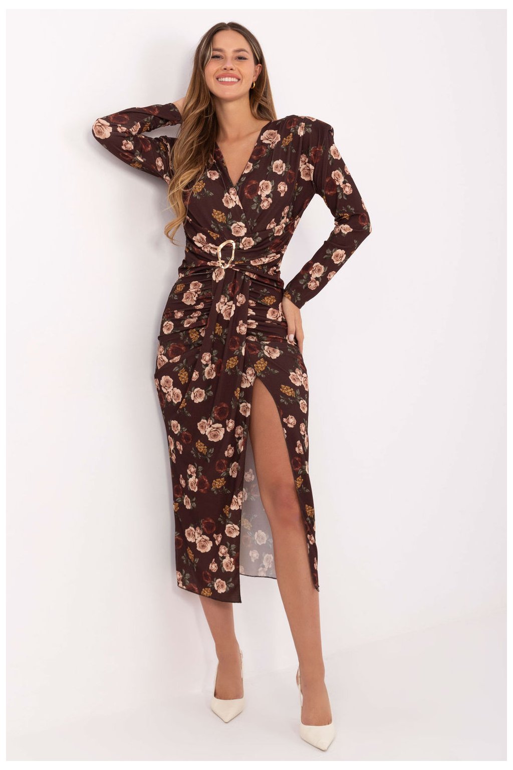 Elegantní olověná šaty jsou ideální volbou na speciální události. Vyrobené z příjemné směsi viskózy a polyesteru, krásně padnou na postavě, zdůrazňují ženské tvary. Model má midi délku a dlouhý rukáv, co mu dodává eleganci a šarm. V přední části je efektní rozpark sahající až k hýždím, který jemně zdůrazňuje nohu a dodává celku smyslný charakter. Přesýpací výstřih opticky prodlužuje krk a zdůrazňuje dekolt, a ozdobné zástřihy s kovovým prvkem jsou elegantním prvkem, který přitahuje pozornost. Květinový vzor šatů se skvěle hodí na večírky, recepce a společenské události, spojuje ženskost, eleganci a pohodlí v jednom.