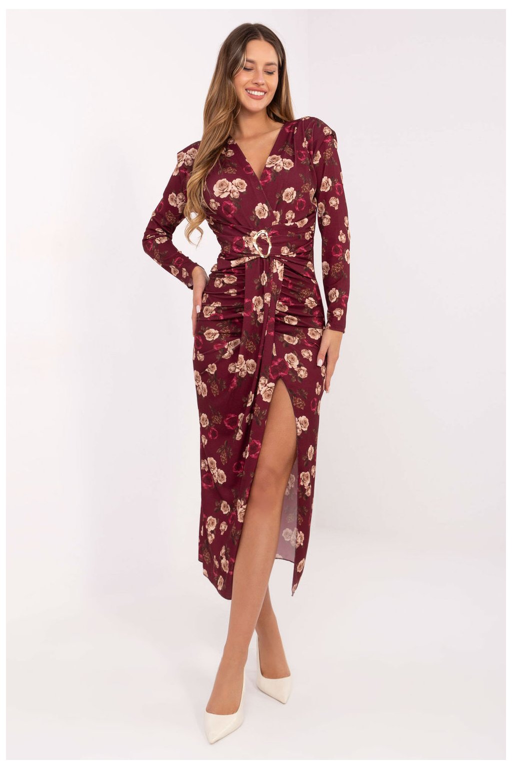 Elegantní úzké šaty jsou ideální volbou na speciální příležitosti. Vyrobené z příjemné směsi viskózy a polyesteru se krásně přizpůsobují postavě, zdůrazňují ženské tvary. Model má midi délku a dlouhý rukáv, co mu dodává eleganci. Na přední straně je efektní rozpark sahající až k hýždím, který jemně zdůrazňuje nohu a dodává celku smyslný charakter. Přesýpací výstřih opticky zjemňuje krk a zdůrazňuje dekolt, ozdobné záhyby s kovovým prvkem jsou elegantním akcentem, který přitahuje pozornost. Šaty s květinovým vzorem se skvěle hodí na večírky, recepce a formální události, spojují ženskost, eleganci a pohodlí v jednom.