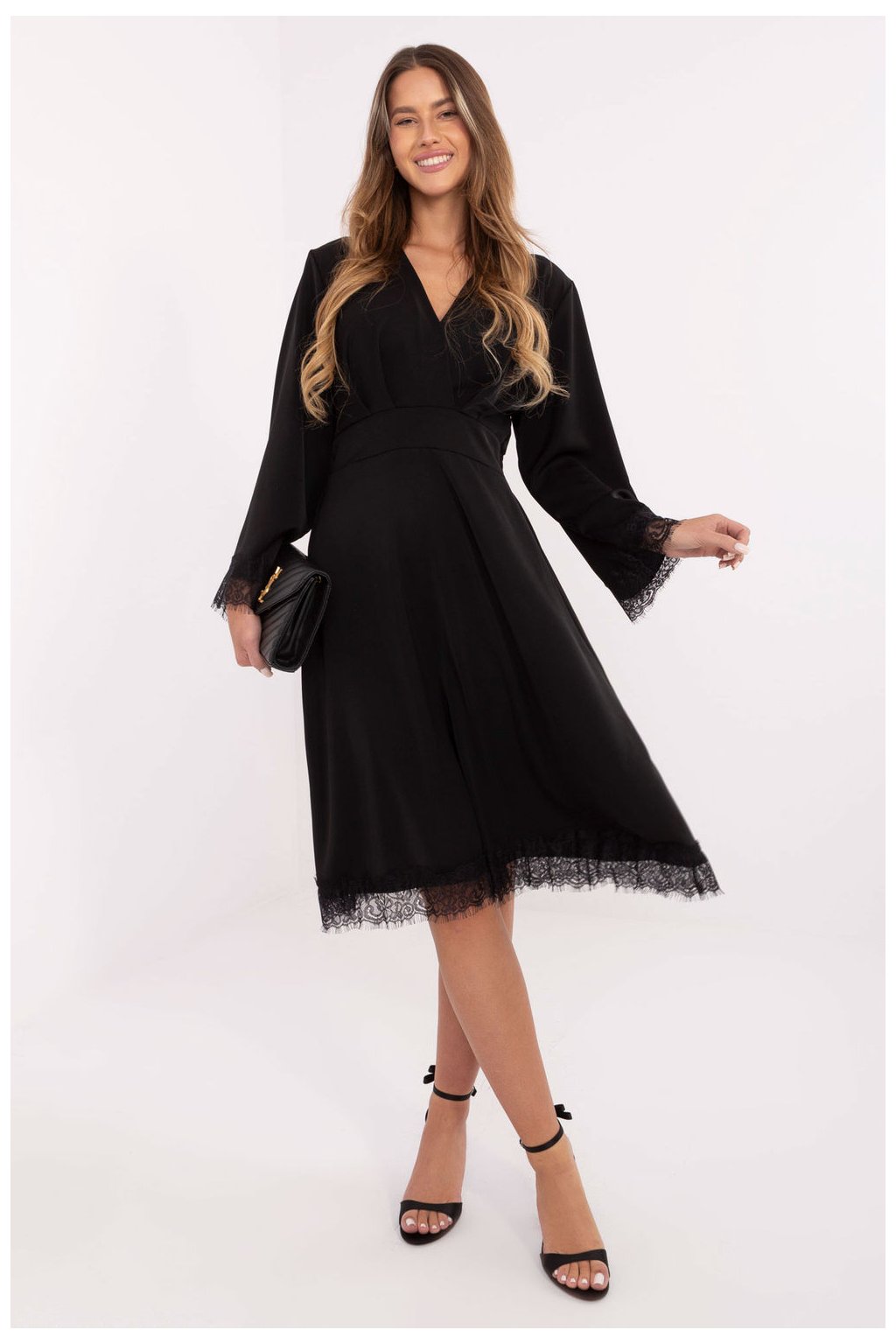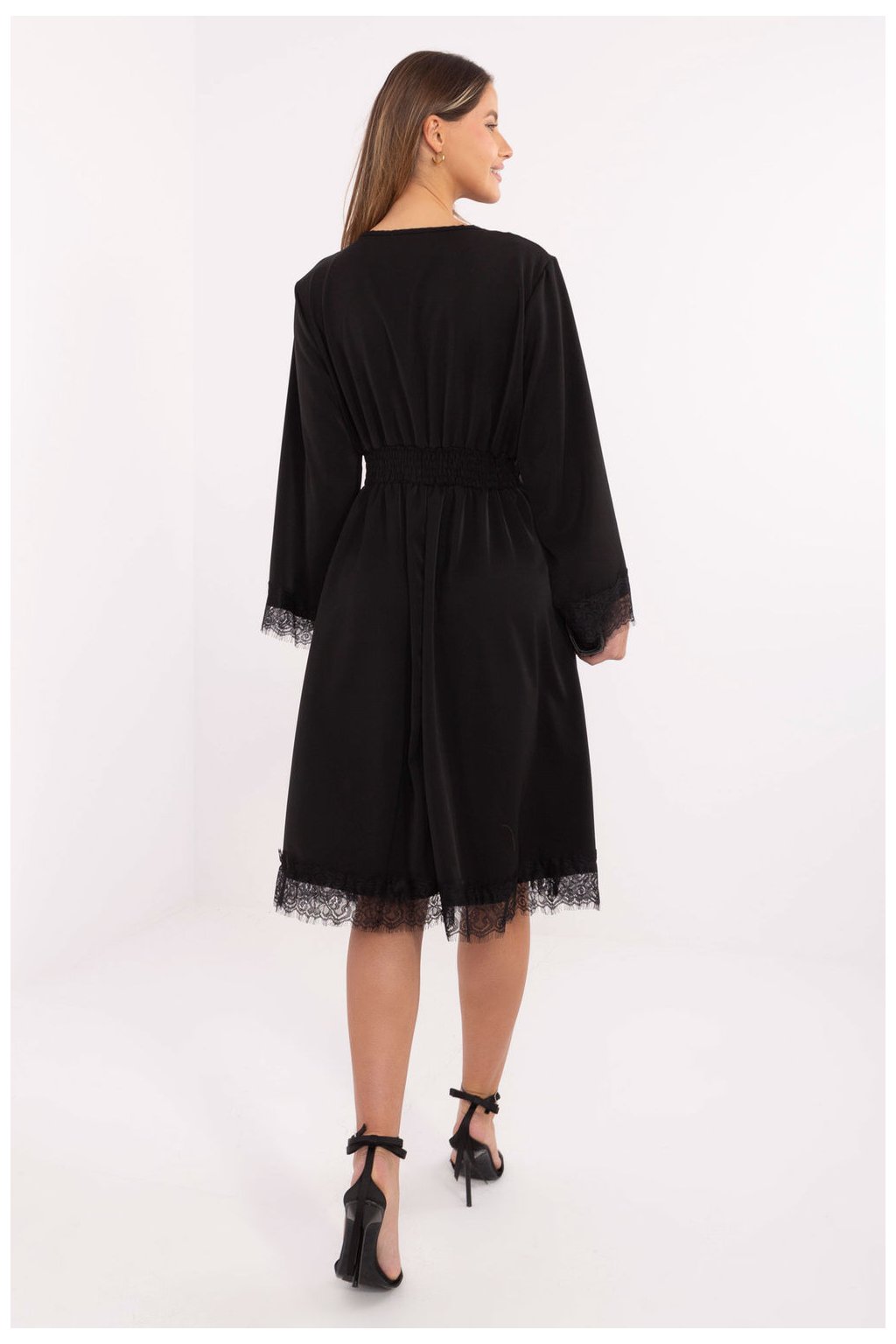 Elegantní rozkročené šaty, které kombinují eleganci s jemnou ženskou grácií. Vyrobené z vysoce kvalitní směsi polyesteru a viskózy, jsou příjemné na dotek, vzdušné a skvěle padnou na postavu. Model midi délky s klopovým výstřihem krásně zdůrazňuje postavu, zatímco rozkročený střih dodává lehkost a volnost. Dlouhé rukávy a krajkové detaily na manžetách a spodku šatů dodávají celku jemnost a eleganci. Vsazované gumy na pasu vzadu zajistí ideální přizpůsobení a pohodlí při nošení a zvýrazní zároveň pas. Šaty nemají zapínání, což je činí mimořádně pohodlnými na oblékání. Skvělá volba na každý den do práce, stejně jako na více slavnostní příležitosti, kdy chcete vypadat elegantně a cítit se volně.