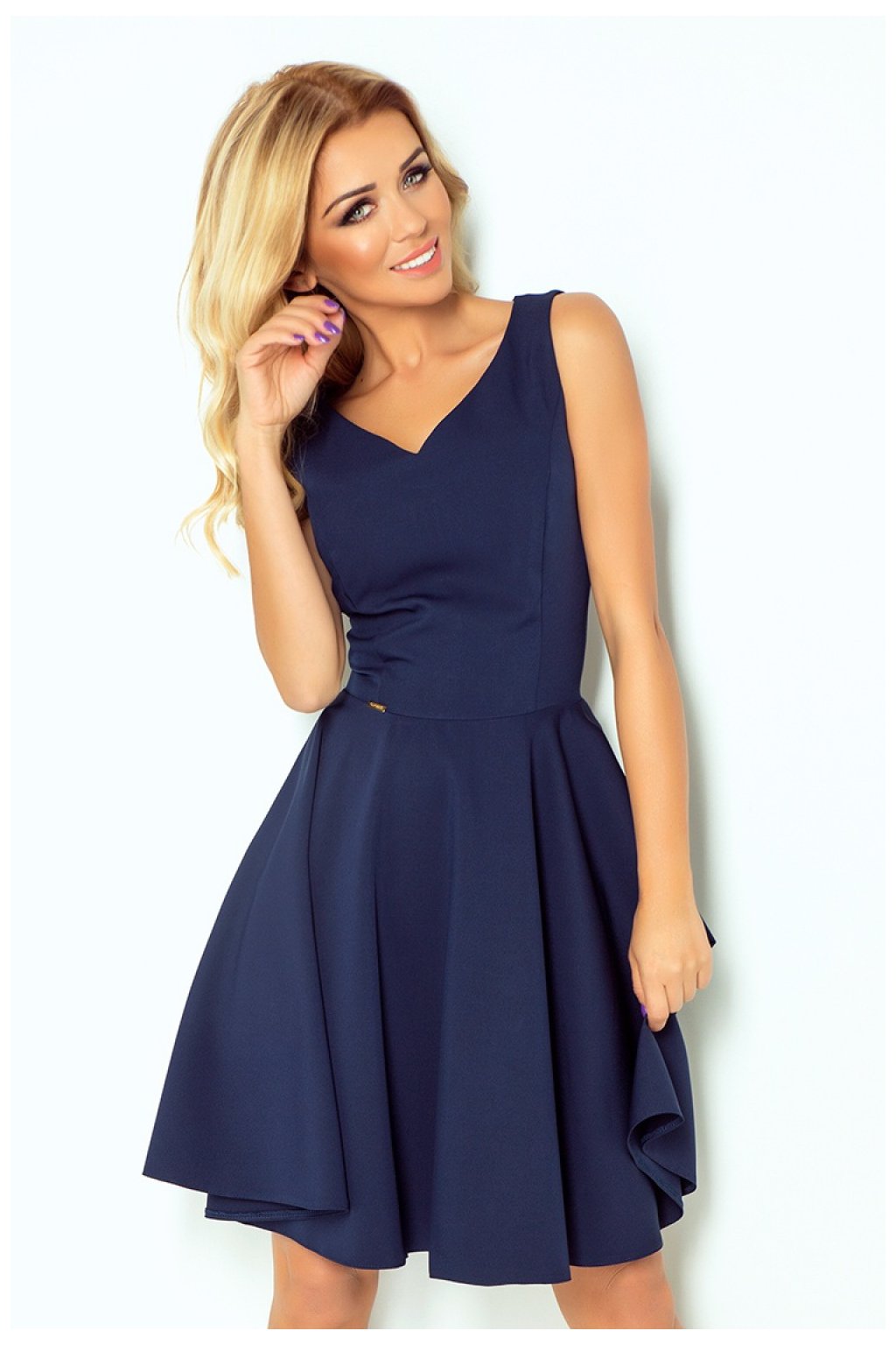 Rozšířené šaty s výstřihem ve tvaru srdce v tmavě modré barvě. Vysoce kvalitní materiál příjemný na dotek - není elastický.Složení: 95 % polyester, 5 % elastan