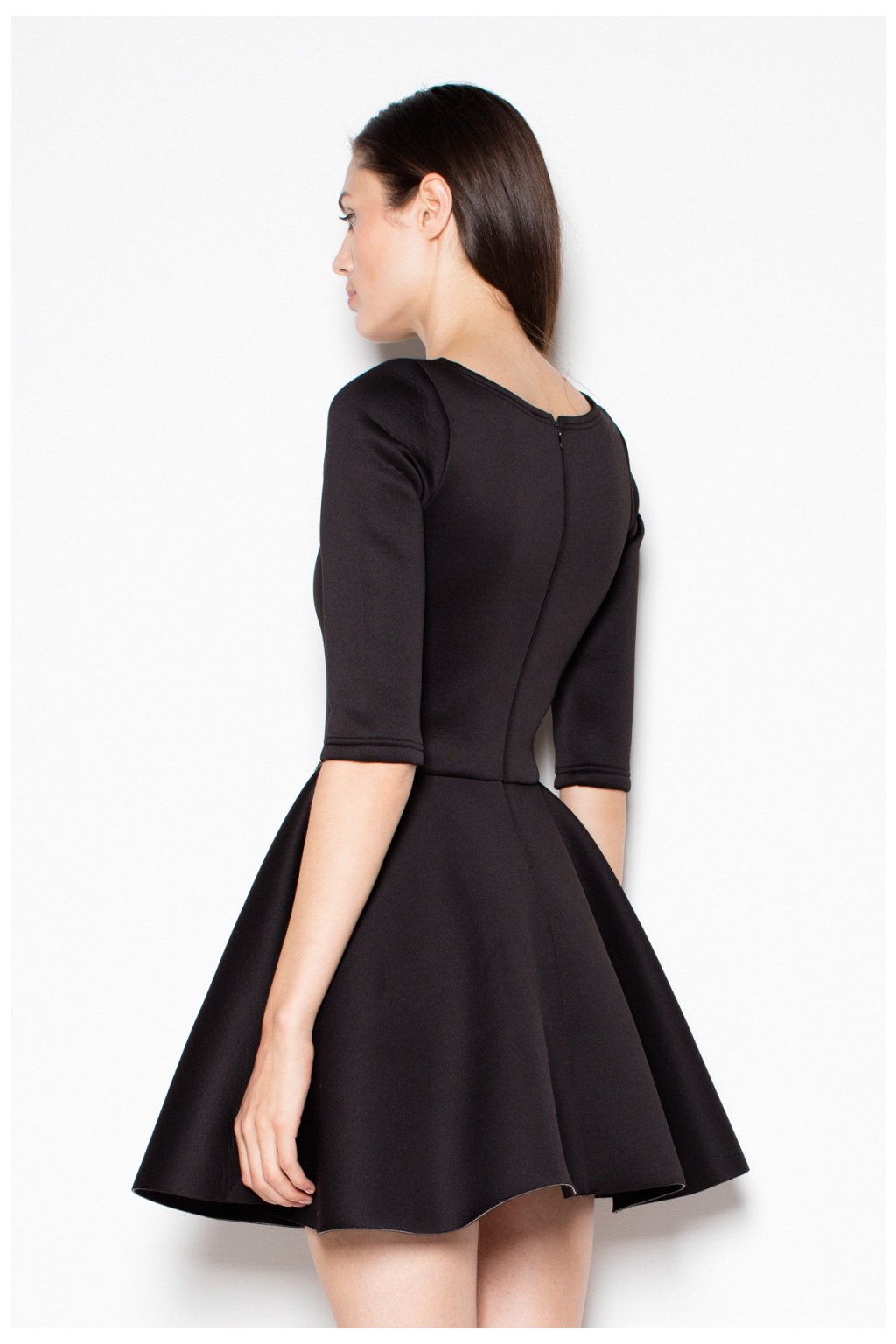 Koktejlové šaty s dlouhými rukávy a půlkruhovým výstřihem. Spodní část šatů je rovná s drapérií na levé nohavici. Šaty bez zapínání.