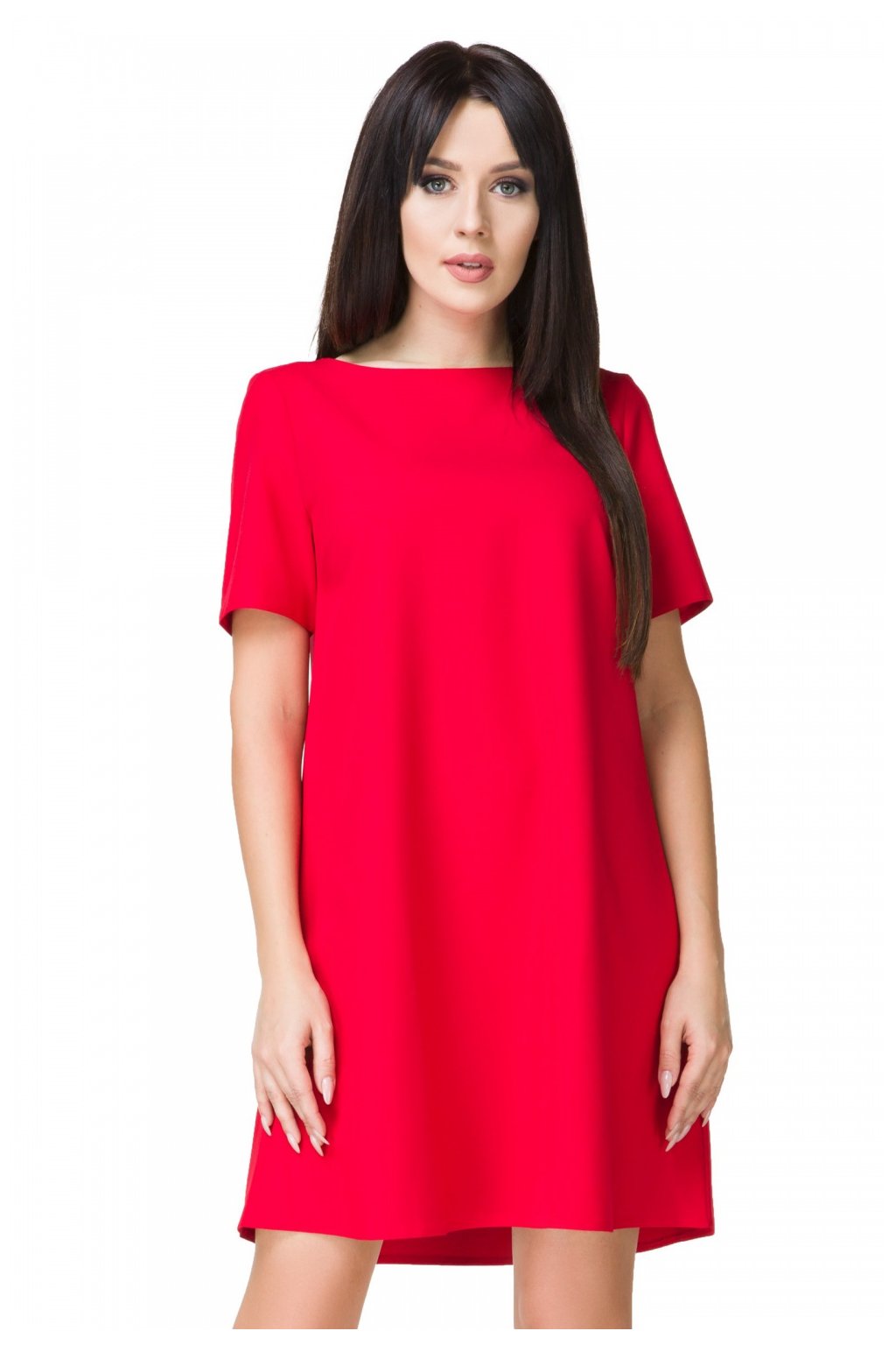 Elegantní krátké trapézové šaty širokého střihu. Rovný výstřih, krátké rukávy. Dno je jemně zaoblené. Lehké a vzdušné šaty, ideální pro letní dny. Díky svému univerzálnímu charakteru se hodí pro pracovní i rodinné akce. Ideální pro každý typ postavy. Doplňte je svými oblíbenými doplňky a užívejte si pohodlné každodenní i sváteční nošení.Polyester 95 %