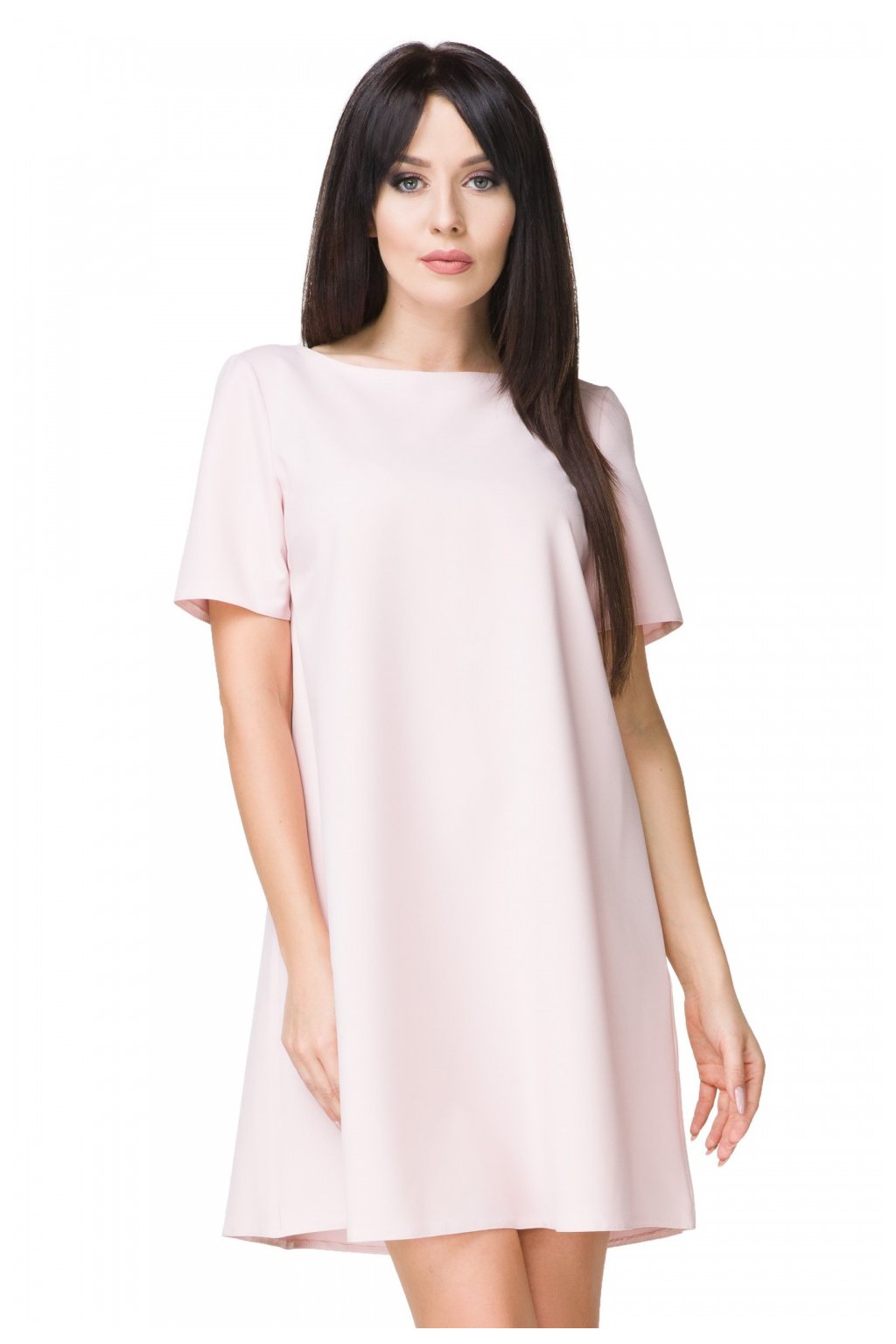 Elegantní krátké trapézové šaty širokého střihu. Rovný výstřih, krátké rukávy. Dno je jemně zaoblené. Lehké a vzdušné šaty, ideální pro letní dny. Díky svému univerzálnímu charakteru se hodí pro pracovní i rodinné akce. Ideální pro každý typ postavy. Doplňte je svými oblíbenými doplňky a užívejte si pohodlné každodenní i sváteční nošení.Polyester 95 %