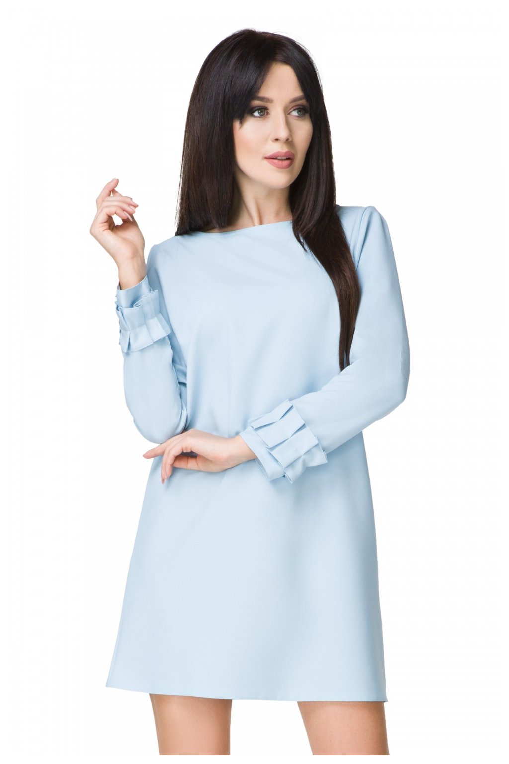 Elegantní, jednoduché mini šaty s mírně trapézovým střihem. Rovný výstřih zakončený přehozem, dlouhé rukávy. Ozdobný volán na rukávech. Šaty vhodné pro každodenní nošení i pro různé slavnosti a zahradní párty.Polyester 95 %