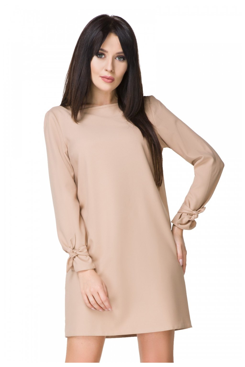 Elegantní mini šaty s mírně trapézovým střihem. Ozdobná očka na zádech s prodlouženým lemem. Ozdobné zavazování na rukávech. Lodičkový výstřih, dlouhé rukávy. Šaty jsou ideální pro každodenní nošení do práce, na zahradní párty nebo jiné rodinné akce.Polyester 95 %