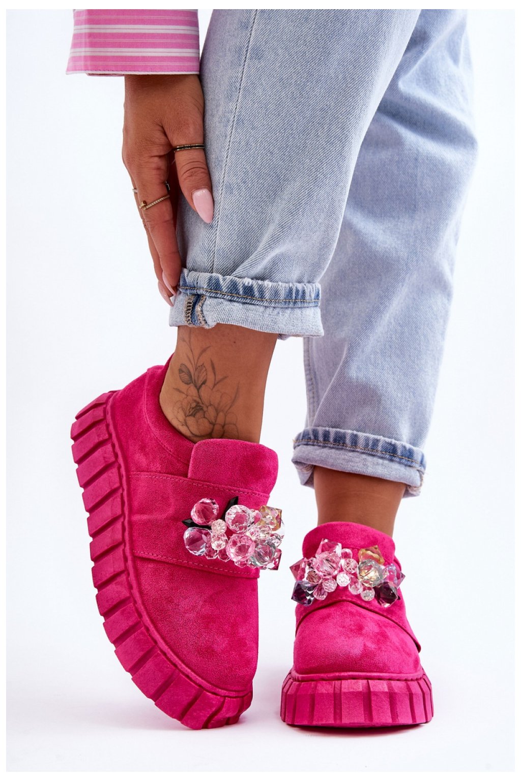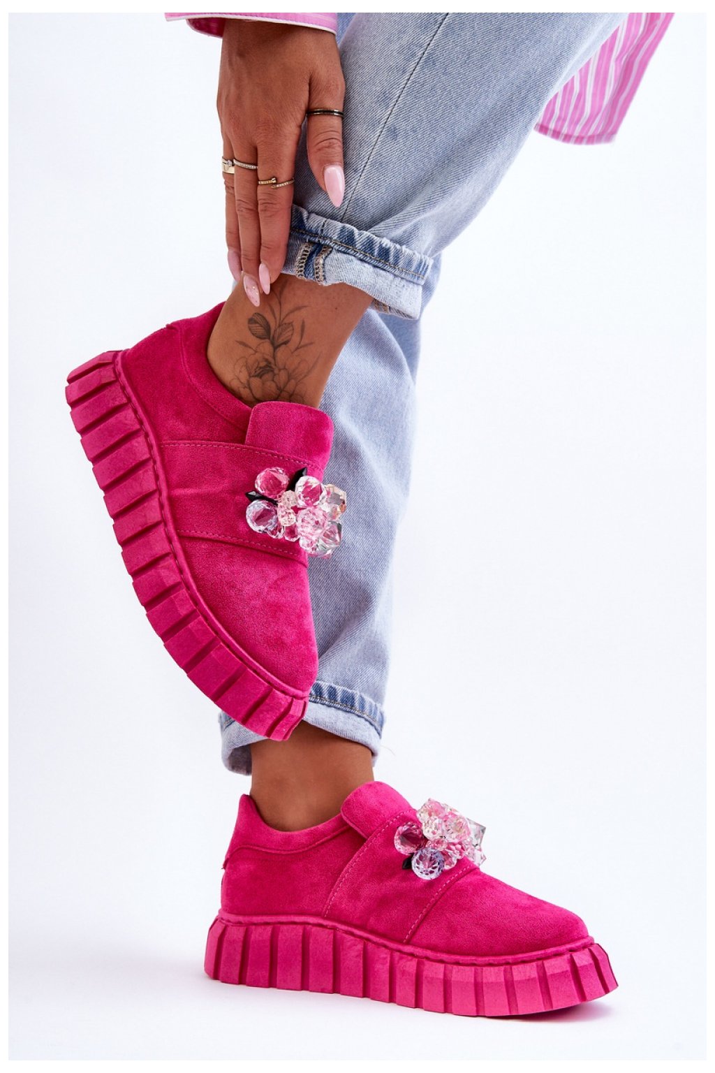 Tyto jedinečné sportovní boty vám jistě ukradnou srdce! Jsou vyrobeny z měkkého ekologického semiše. Model je nazouvací a navíc má na přední straně ozdobu v podobě krystalů. Boty jsou usazeny na pevné platformě s protiskluzovou podrážkou. Měkká stélka z kombinace pěny a textilního materiálu zajistí pohodlné používání obuvi.