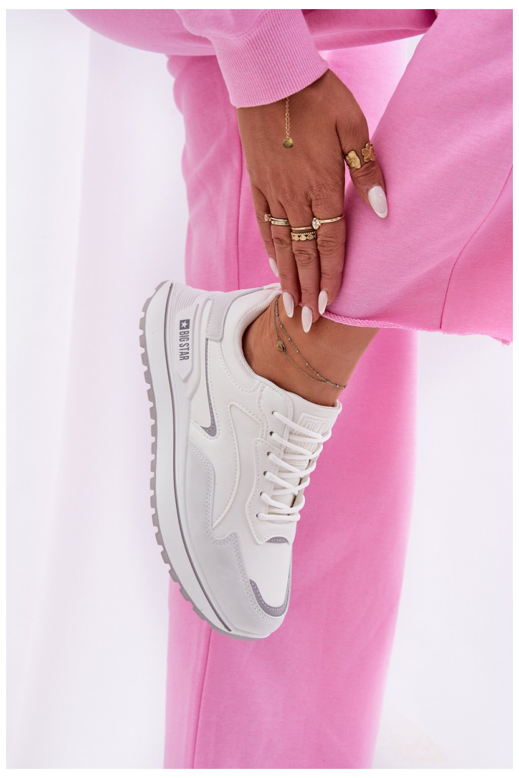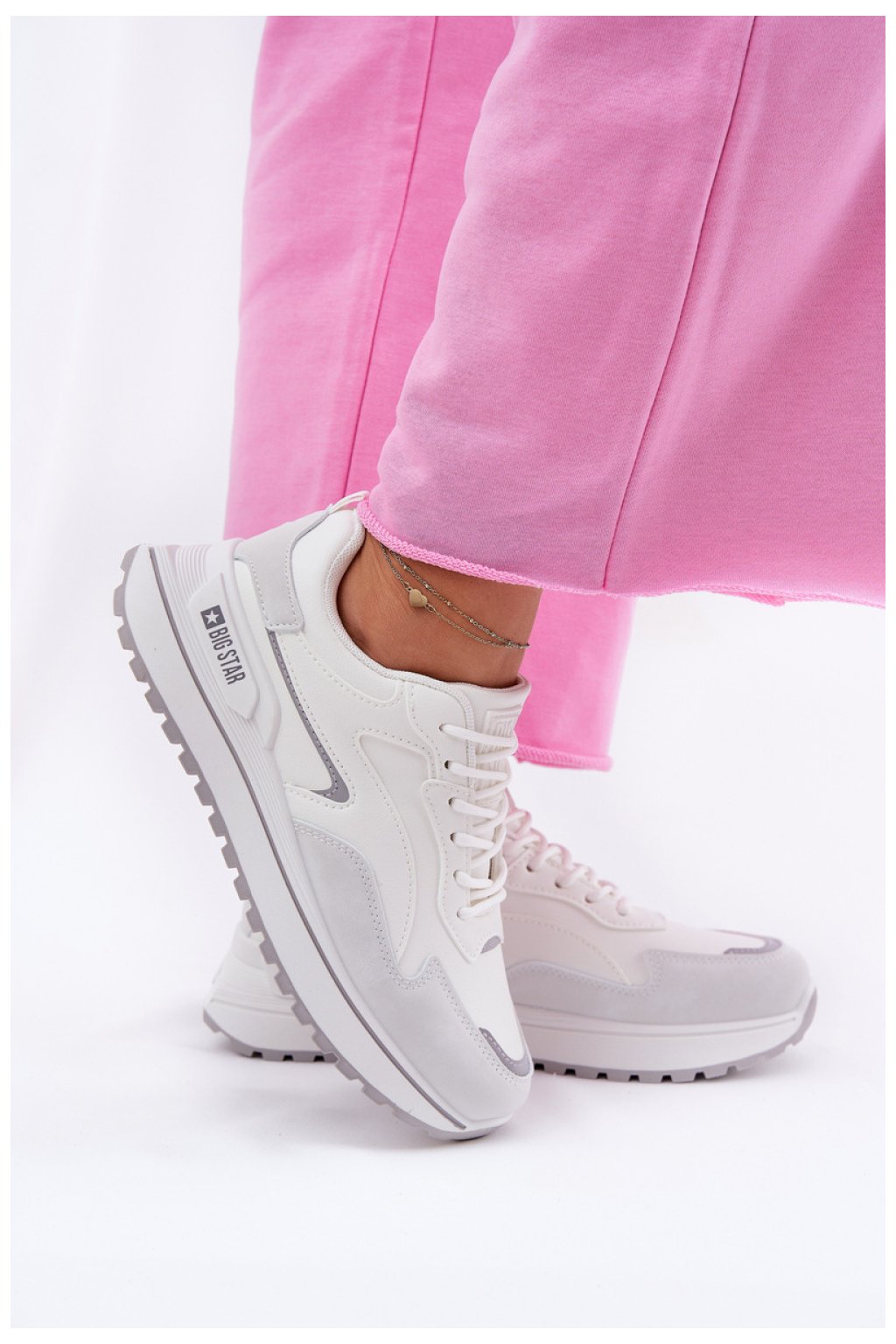 Tenisky dámské značky Big Star. Vyrobené z ekologické kůže. Umístěné na platformě. Špičky bot jsou zaoblené, co zajišťuje pohodlí po celý den. Vložka HI-POLY SYSTEM, pocházející z recyklace, se vyznačuje odolností proti otěru a deformacím, stejně jako účinně absorbuje vlhkost a tlumí nárazy, poskytující pohodlí během intenzivních aktivit. Jedná se o obuv, která spojuje funkčnost s módním vzhledem.