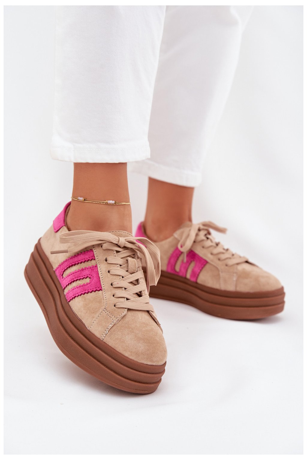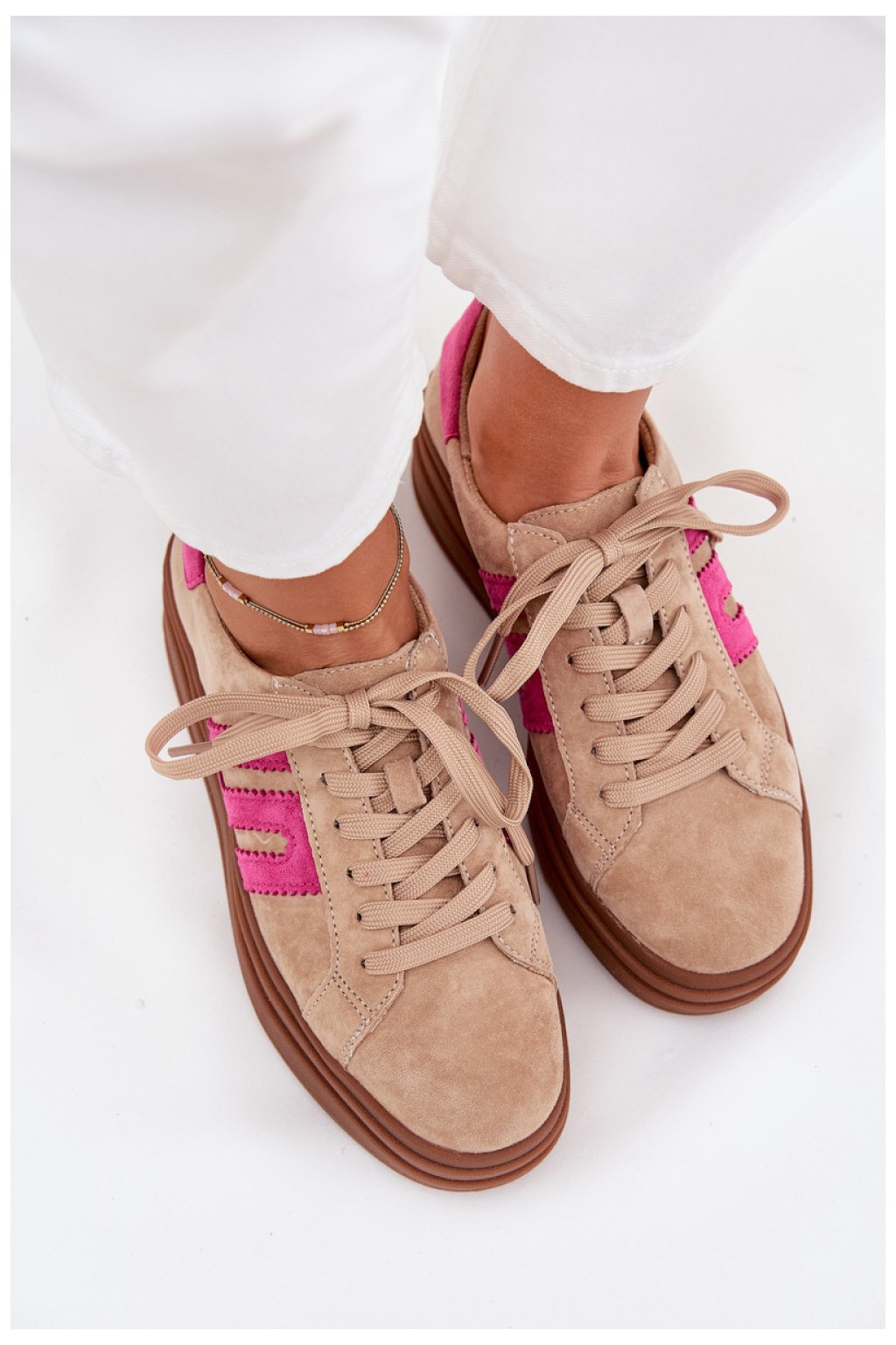Tenisky pro ženy z přírodního semiše jsou spojením elegance a pohodlí. Umístěné na platformě dodávají postavě lehkost a výšku a zároveň zajistí pohodlí každým krokem. Zaoblené špičky dávají botám jemný, klasický vzhled. Tento model má měkkou kůží vložku, která poskytuje další pohodlí a radost z nošení. Ideální pro každodenní stylizace, kombinují módní design s funkčností.