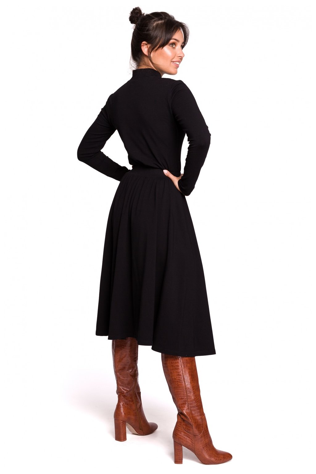 Midi sukně s rozšířeným střihem a rozparkem na boku. Vyrobeno z tenkého úpletu s přídavkem elastanu. V pase jsou elastické. K různým outfitům je můžete kombinovat s botami na vysokém podpatku nebo sportovními teniskami.