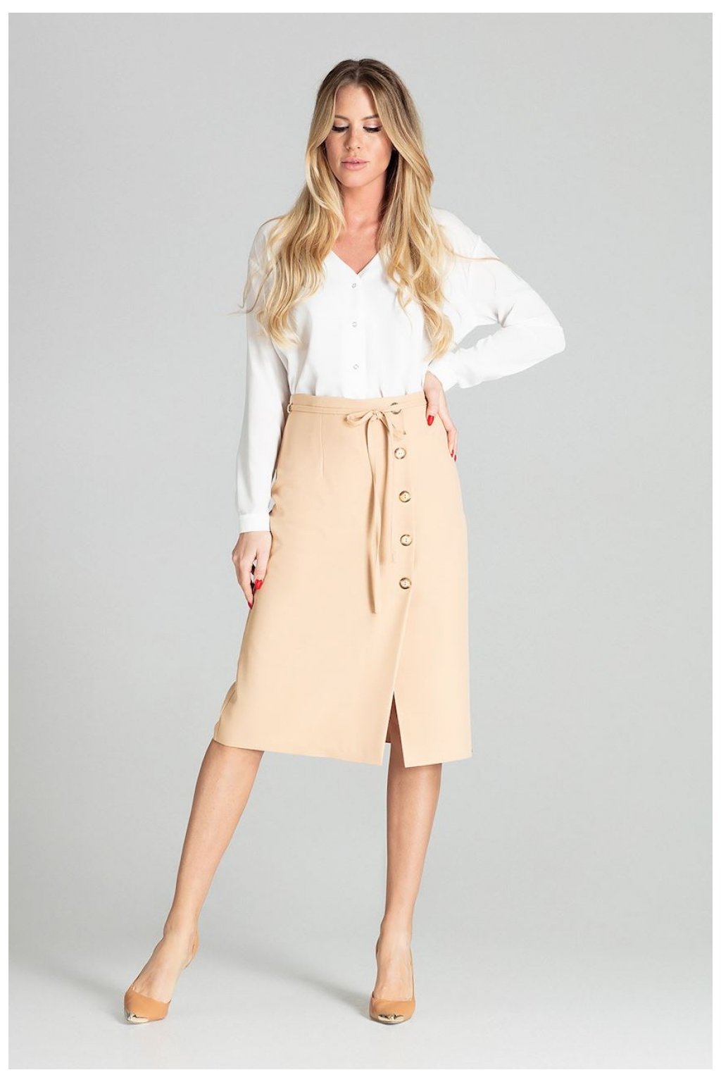 Béžová midi sukně bez kapes a bez podšívky. Překrytí levé přední nohavice ozdobnými knoflíky. Krytý zip na boku, ozdobný pásek na zavazování.