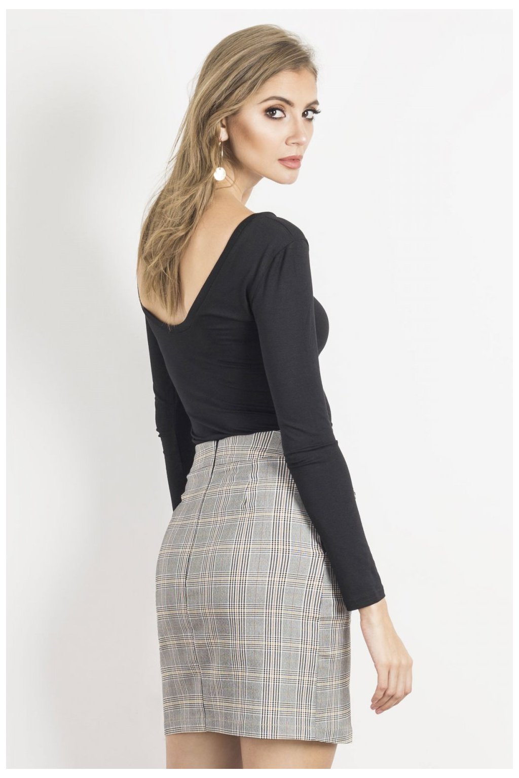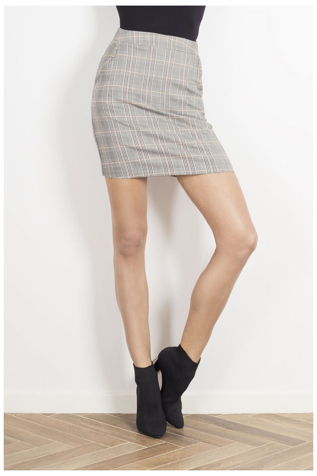 Krátká sukně z elastické kostkované tkaniny. Sukně s vysokým nártem. Na zadní straně je skrytý zip pro snadné oblékání. Sukně bez podšívky. Vyrobeno v Polsku.