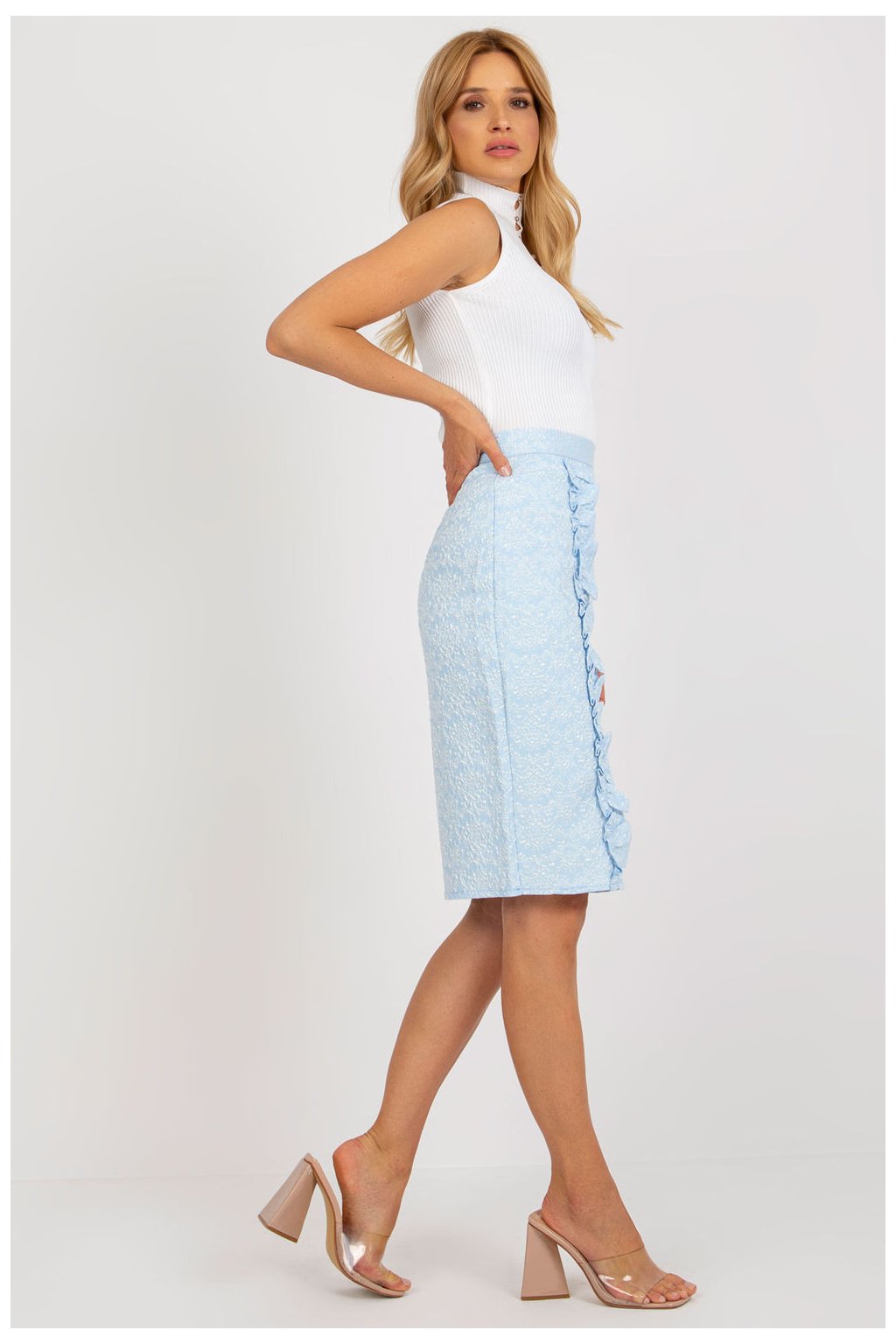 Elegantní tužková sukně s vyšším pasem, zapínaná na krytý zip. Sukně ze zajímavě strukturované látky s podšívkou, na přední straně ozdobný volán.