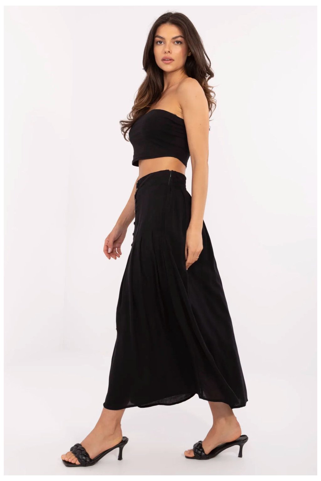 Elegantní plisovaná sukně midi délky je skvělým návrhem pro každodenní nošení i do práce. Vyrobená z ekologické viskózy spojuje módní vzhled s pohodlím nošení a ohleduplností k životnímu prostředí. Model s hladkým zpracováním a ozdobnými knoflíky vpředu vypadá elegantně a moderně. Plisování dodává lehkost a elastický pásek se vsunutým gumou vzadu zajistí pohodlné přizpůsobení k postavě. Skrytý zip na boku usnadňuje oblékání a nezakrývá linii střihu. Jedná se o univerzální a ženskou sukní, která skvěle padne do každodenních i kancelářských stylizací.