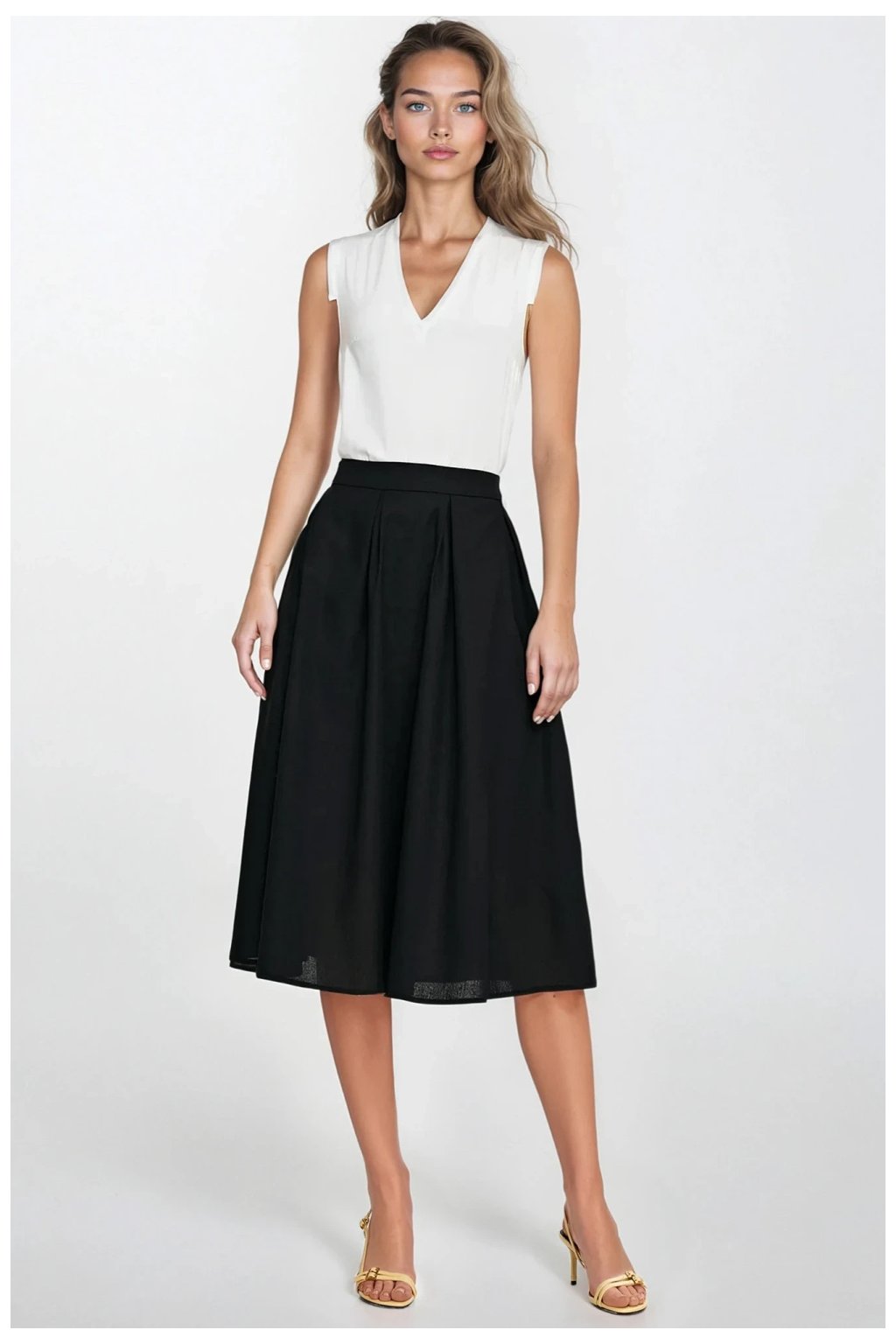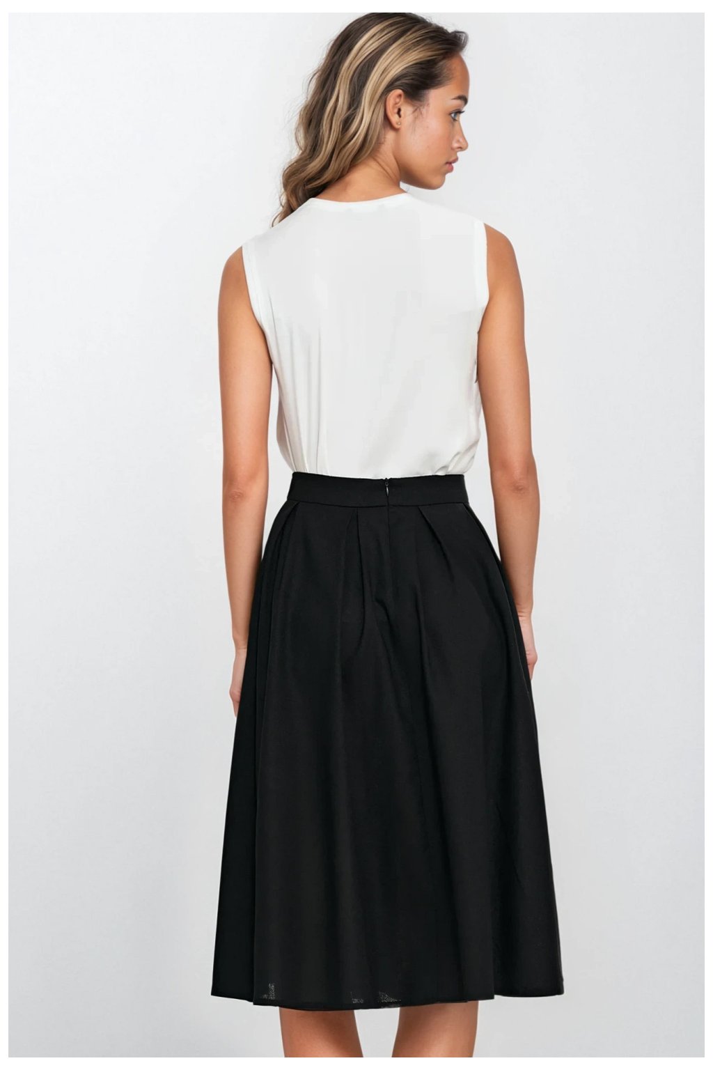 Sukně s pravidelným střihem, vyrobena z materiálu s lnu podobnou strukturou, spojení viskózy s přídavkem lnu zajišťuje pohodlné nošení a přirozený, lehce rustikální vzhled. Midi délka činí tento model skvělým doplňkem do každodenních i elegantních stylizací. Dekorativní záložky rozmístěné kolem celého obvodu těsně pod pasem dodávají sukni lehkost a jemný objem. Praktické kapsy skryté v bočních švech spojují funkčnost s diskrétním stylem. V zadní části je skrytý zip, který zajišťuje pohodlné zapínání a estetické dokončení. Ideální volba na teplé dny do práce, na procházku nebo setkání s přáteli.