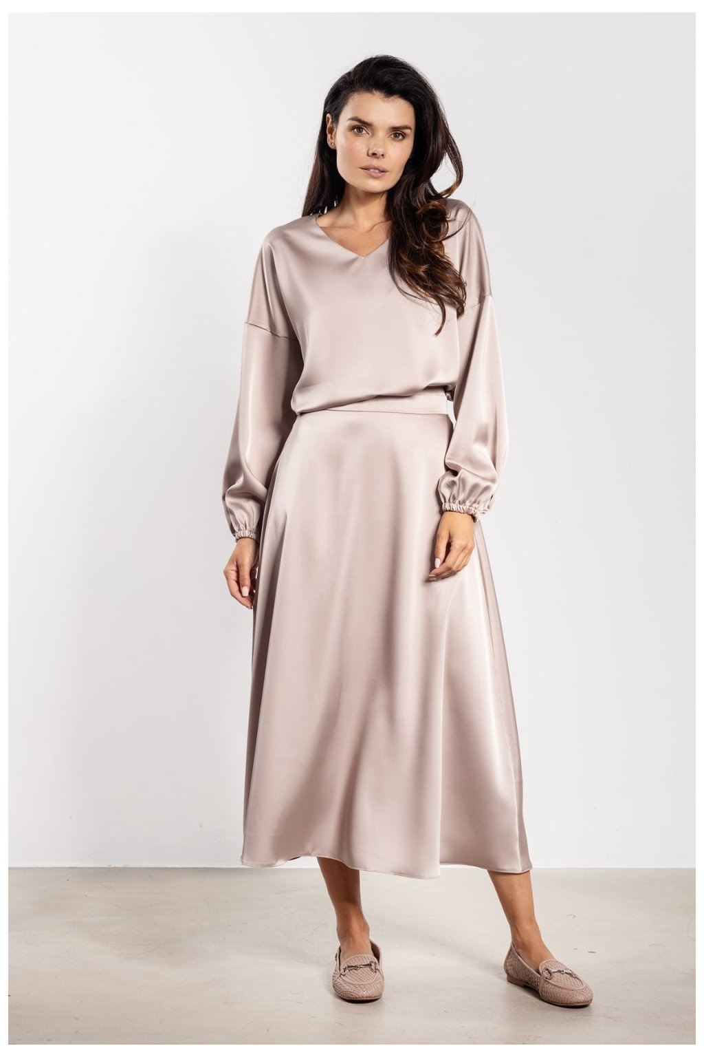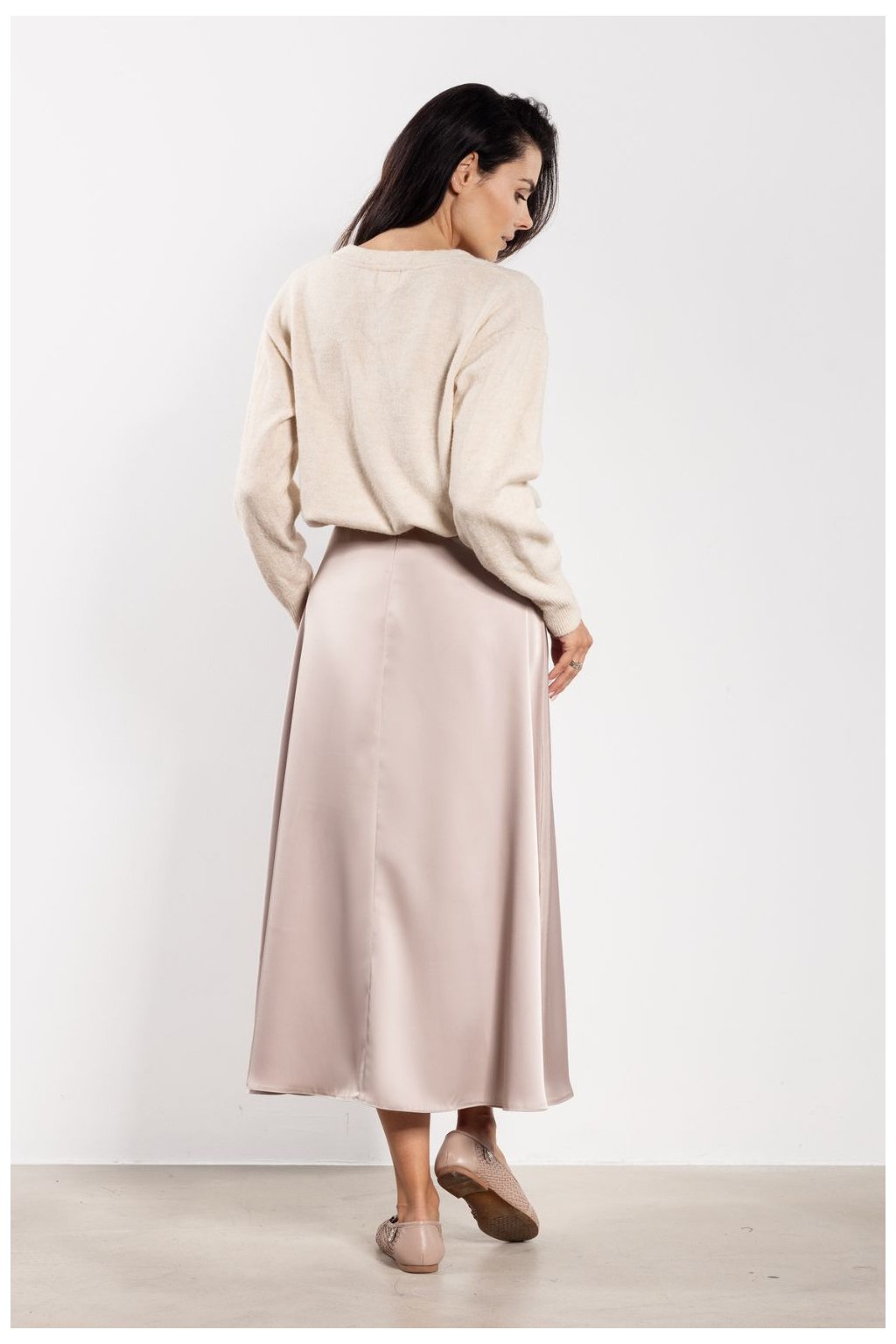 Saténová midi sukně je klasický a elegantní kousek šatníku. Jemný lesk látky dodává outfitu výjimečný charakter, který je vhodný jak na každý den, tak i na formální události. Vysoký pas krásně zdůrazňuje pas a opticky prodlužuje postavu. Rozkročený střih zajistí volnost pohybu a lehkost, zatímco délka přes kolena dodá celku nadčasový šarm.