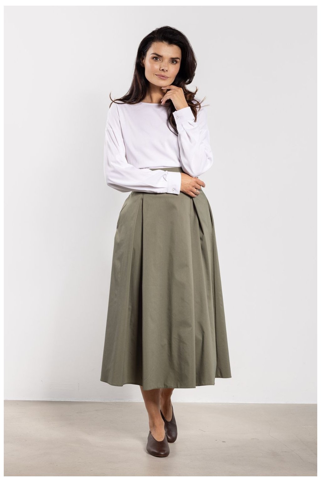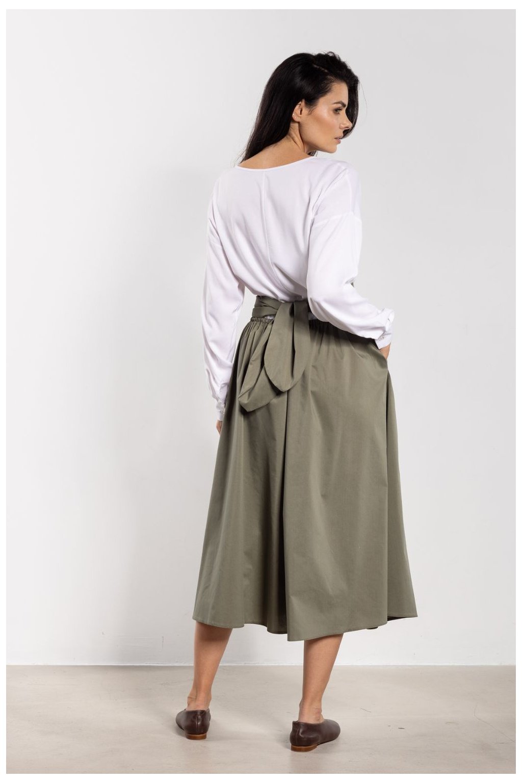 Klasická midi sukně s vysokým pasem krásně zdůrazňuje pas a opticky prodlužuje postavu. Široký pás se šněrováním vzadu dodává ženský charakter a rozkročený spodek se lehce a volně skládá, poskytující pohodlné nošení. Délka pod kolena dělá sukně univerzální, skvěle se hodí jak do každodenních stylizací, tak do elegantních kombinací. Minimalistický střih nabízí mnoho možností kombinací, od klasických košil až po volné svetry a topy.