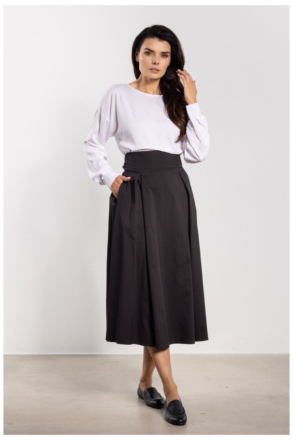 Klasická midi sukně s vysokým pasem krásně zdůrazňuje pas a opticky prodlužuje postavu. Široký pás se šněrováním vzadu přidává ženský charakter, a rozkvetlý spodek se lehce a volně skládá, poskytujíc pohodlí při nošení. Délka nad kolena dělá sukně univerzální, skvěle se hodí jak do každodenních stylizací, tak do elegantních kombinací. Minimální střih poskytuje mnoho možností kombinací, od klasických košil po volné svetry a topy.