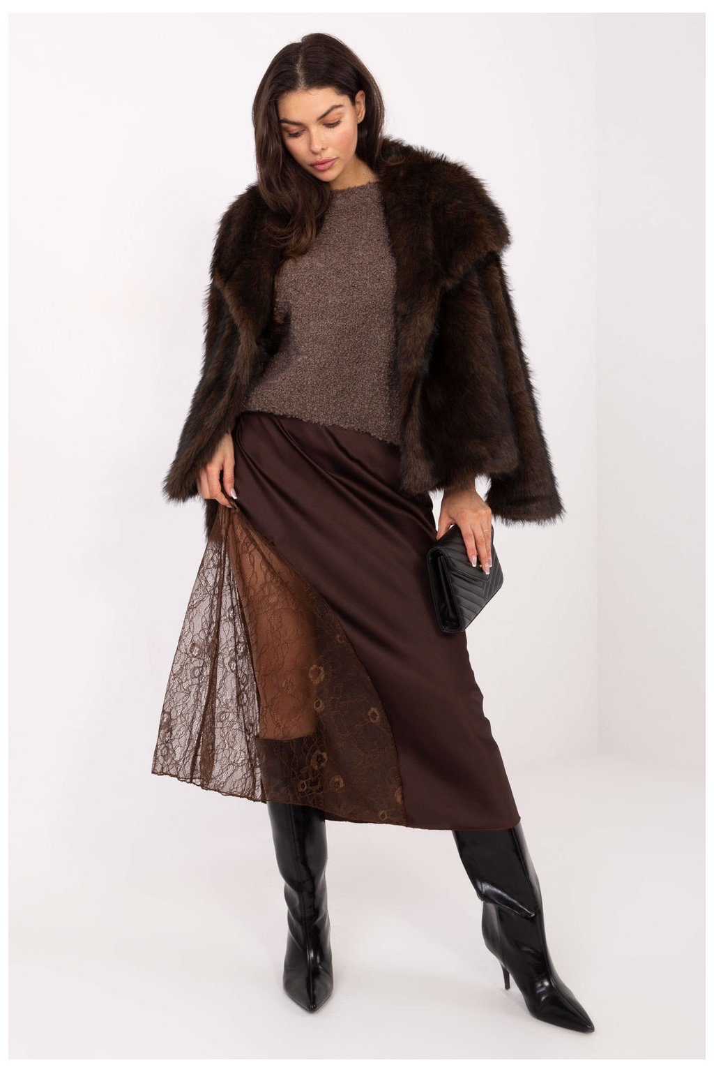 Elegantní a ženská rozkročená midi sukně je ideální kombinací elegance a pohodlí. Vyrobena z hladké látky, krásně padne na postavu, dodává jí lehkost a jemnou eleganci. V pase je vsazena elastická guma, která zajišťuje perfektní přizpůsobení a pohodlí po celý den. Bez zapínání je sukně mimořádně praktická a pohodlná k nošení. Výjimečným prvkem tohoto modelu je krajkový výstřih na levé straně, jemně zdůrazňující nohu a dodávající celku elegantní, ženský charakter. Midi délka dělá sukně ideální na různé příležitosti, od každodenních a do práce, po společenská setkání nebo večírky.
