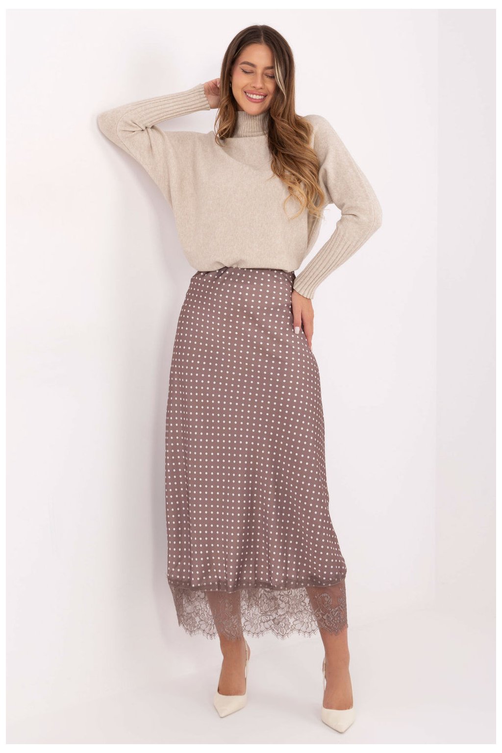 Elegantní a ženská sukně midi délky, vyrobená z příjemného na dotek materiálu, polyesteru s přídavkem elastanu, který zajišťuje pohodlné nošení a ideální přizpůsobení postavě. Model je zdoben jemnou krajkou na spodku, co mu dodává eleganci a decentní charakter. V pasu je vsazena elastická guma, díky čemuž se sukně skvěle přizpůsobí pasu a není potřeba ji zapínat. Materiál ozdobený moderním puntíkovaným vzorem, který dodává celku lehkost a šarm. Jedná se o univerzální model, který se hodí jak na každodenní nošení, do práce, tak i na slavnostní příležitosti.