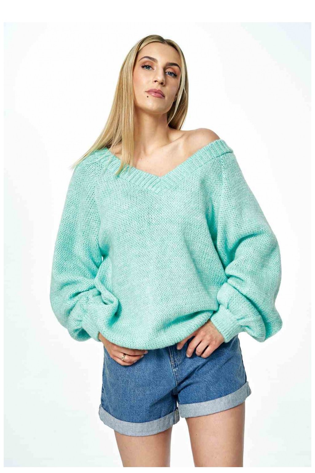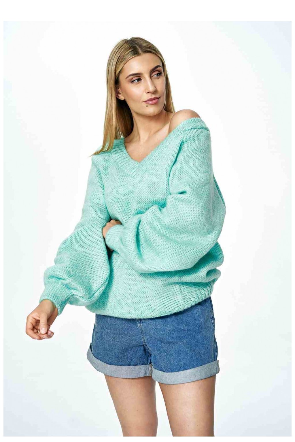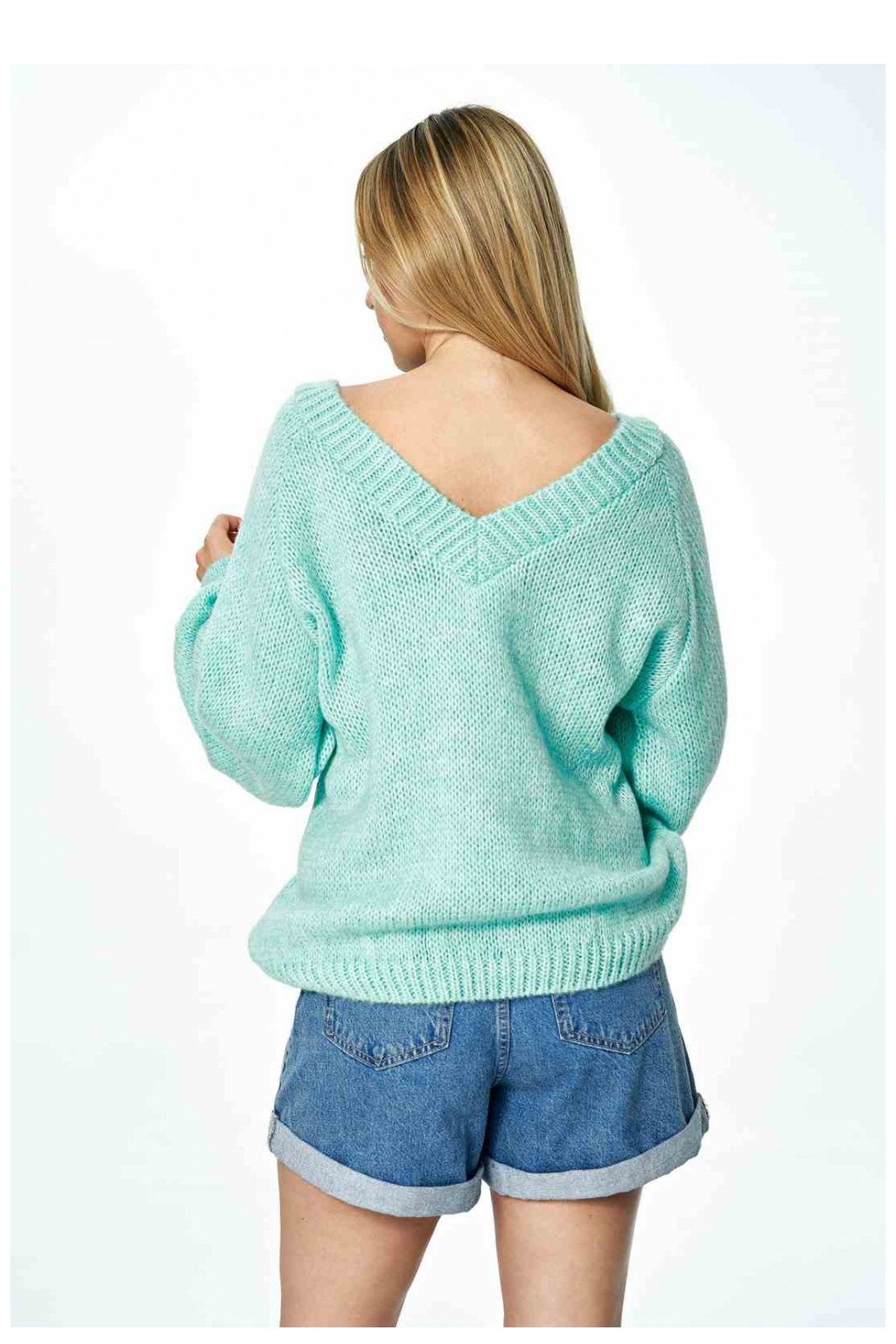 Svetr s hlubokým véčkovým výstřihem vpředu i vzadu. Svetr s dlouhými širokými rukávy.