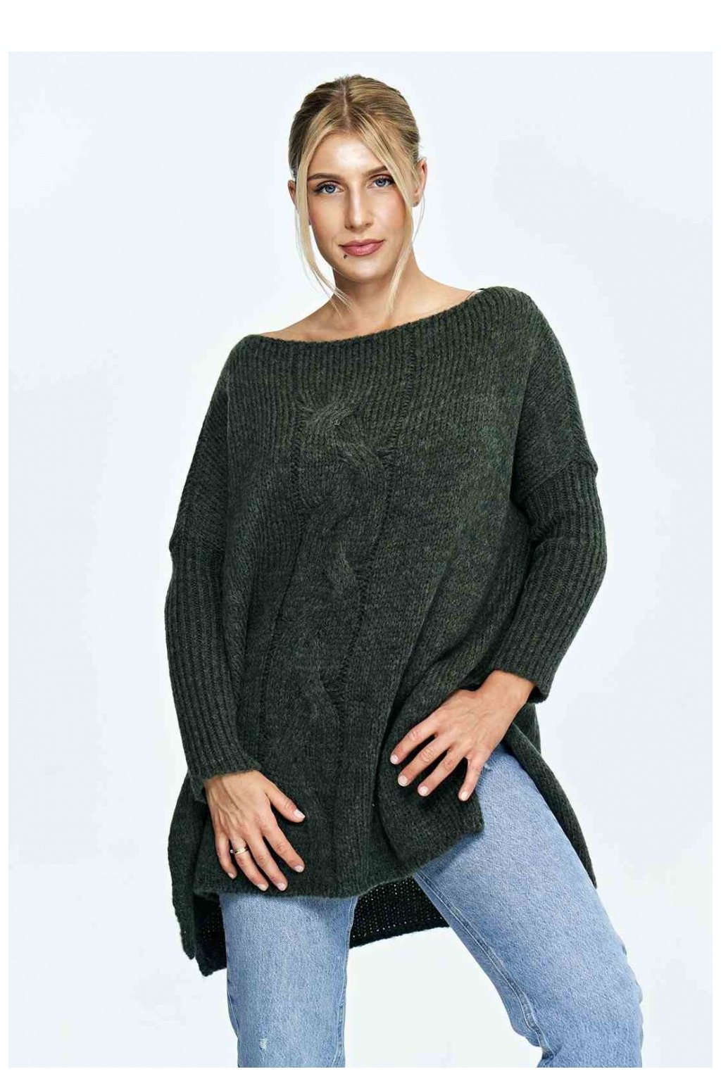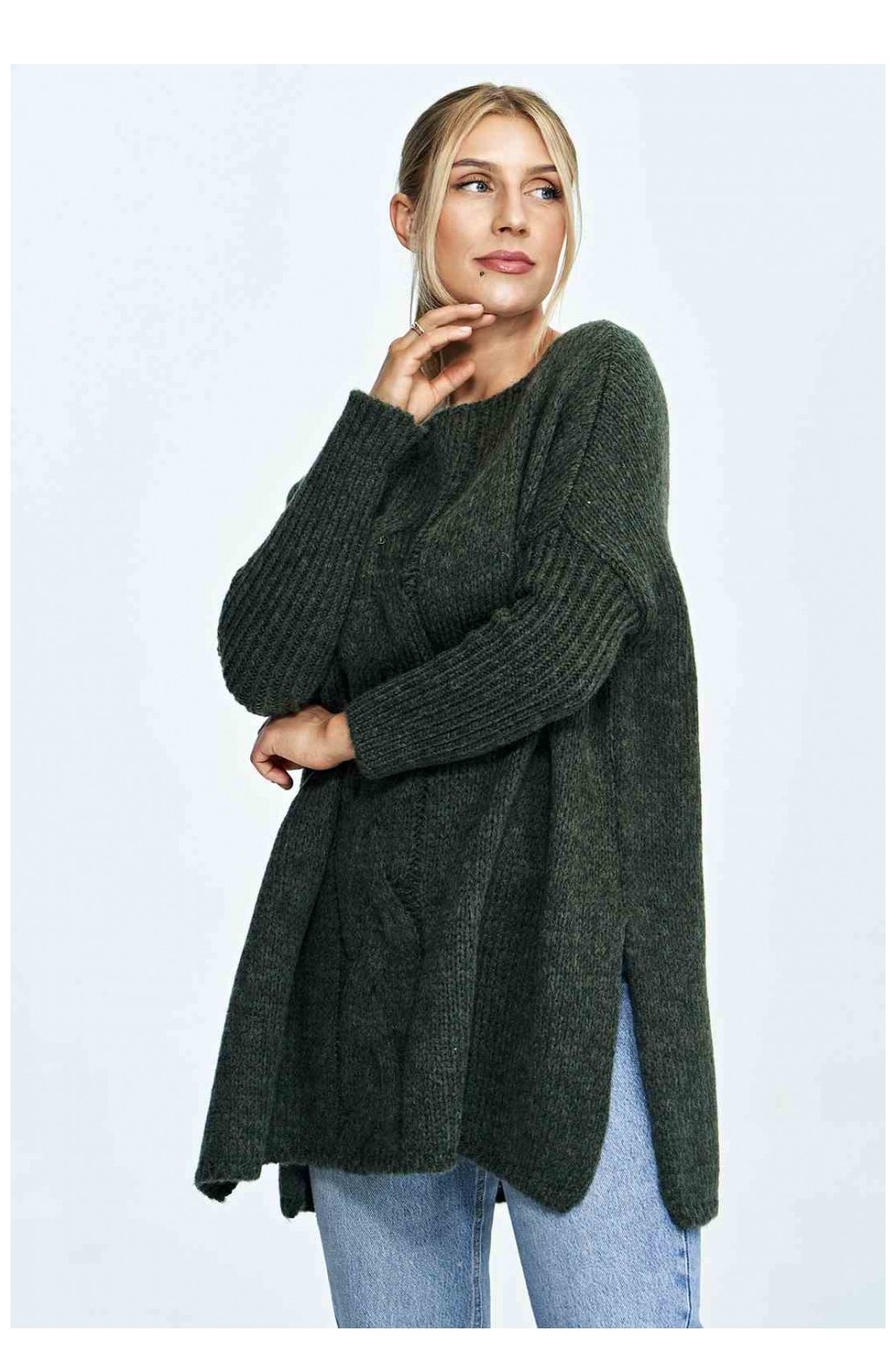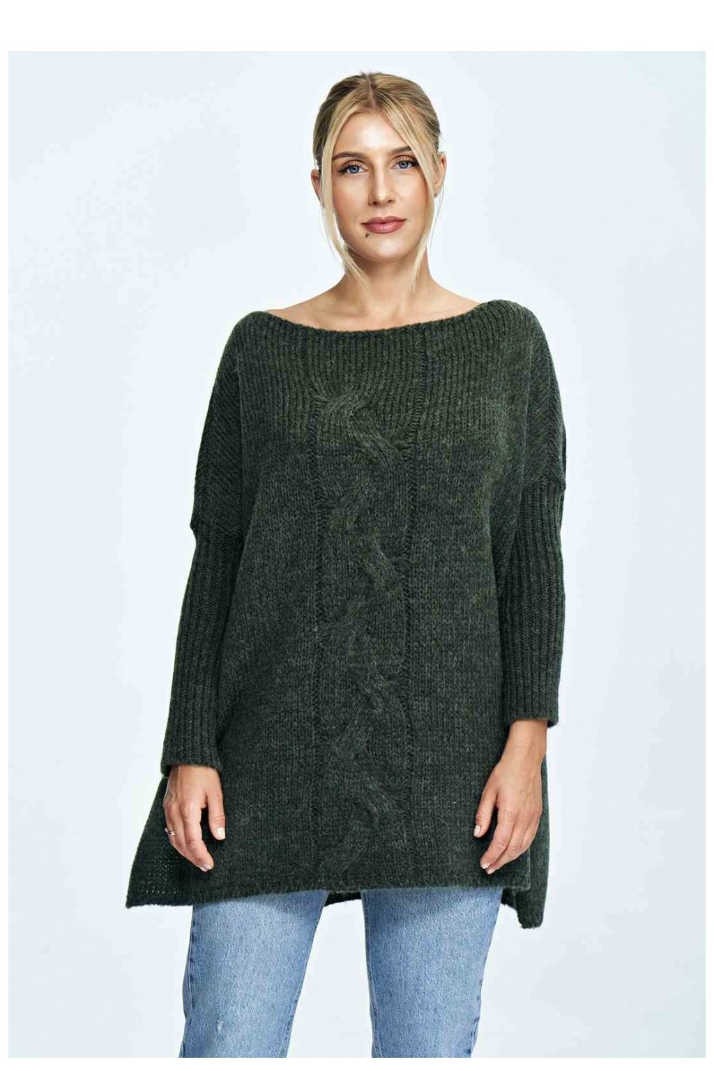 Volný svetr s lodičkovým výstřihem, žebrovanými rukávy, ozdobným nápletem na přední straně a trhlinami na bocích.