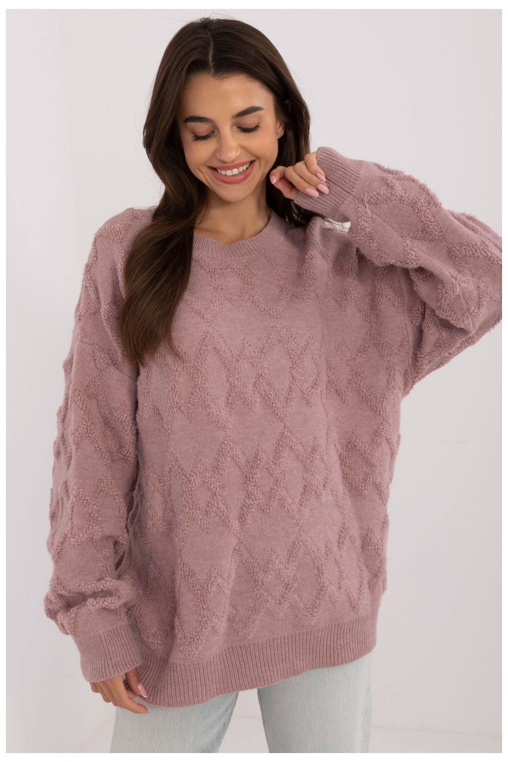 Dámský svetr ve stylu casual, ideální na každodenní příležitosti. Charakterizuje se pestrým vzorem pletení, který dodává subtilní eleganci. Svetr má standardní délku a dlouhé rukávy, což zajišťuje komfort nošení po celý den. Kulatý výstřih zdůrazňuje klasický charakter modelu, který se skvěle hodí jak do práce, tak na volno.
