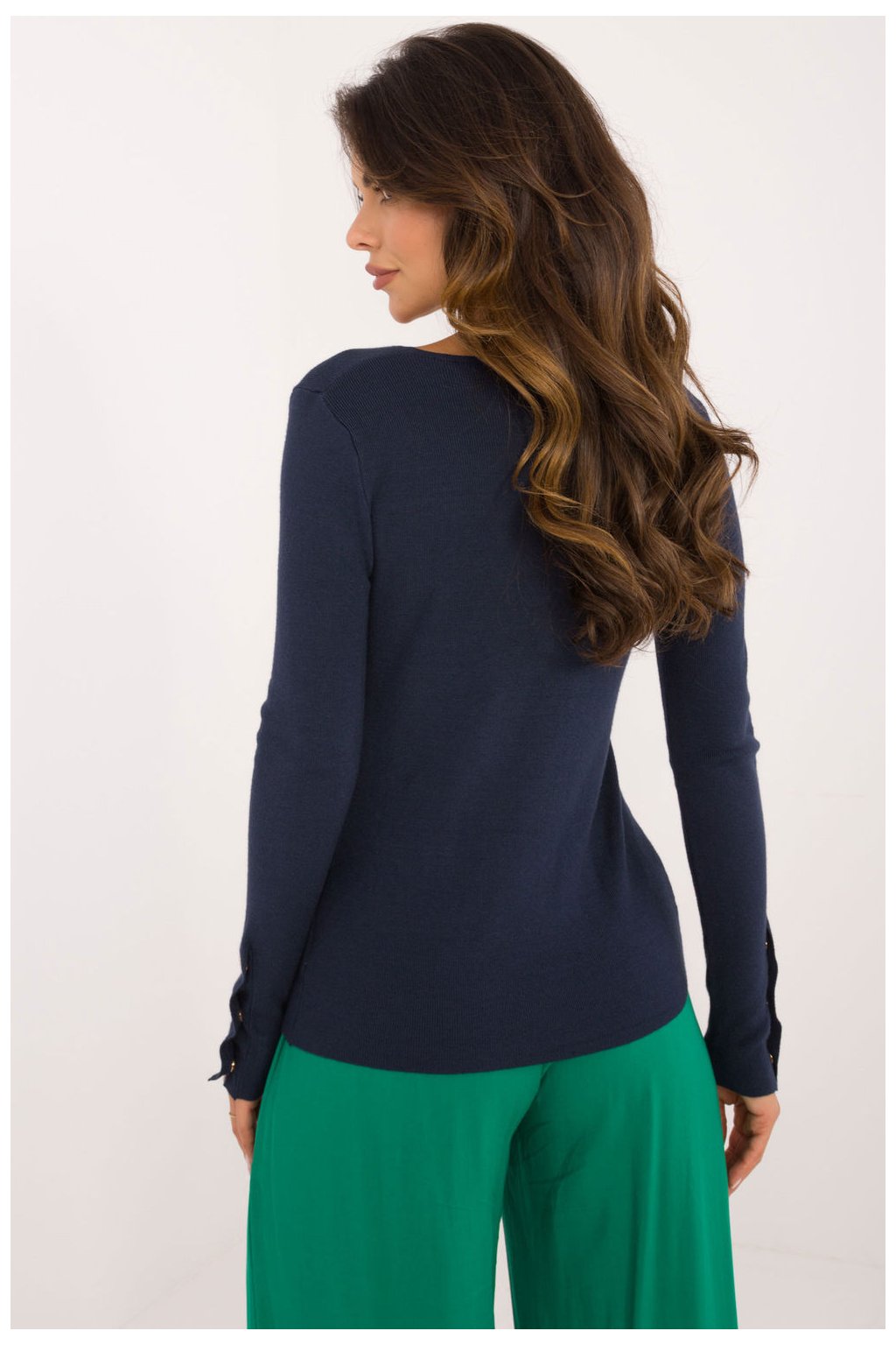 Dámský svetr casual ideální na každý den a do práce. Vyroben z vysoké kvality směsi materiálů: viskózy, polyamidu a polyesteru, zajišťuje pohodlné nošení a trvanlivost. Hladký vzor a klasická délka dělají z něj univerzální kus oblečení. Svetr má dlouhý rukáv zakončený ozdobnými knoflíky na zápěstích, které dodávají jemný, elegantní akcent. Výstřih ve tvaru písmene V (seré) zdůrazňuje krk a dodává celku ženský charakter. Skvělá volba jak do kanceláře, tak na každodenní výstupy.