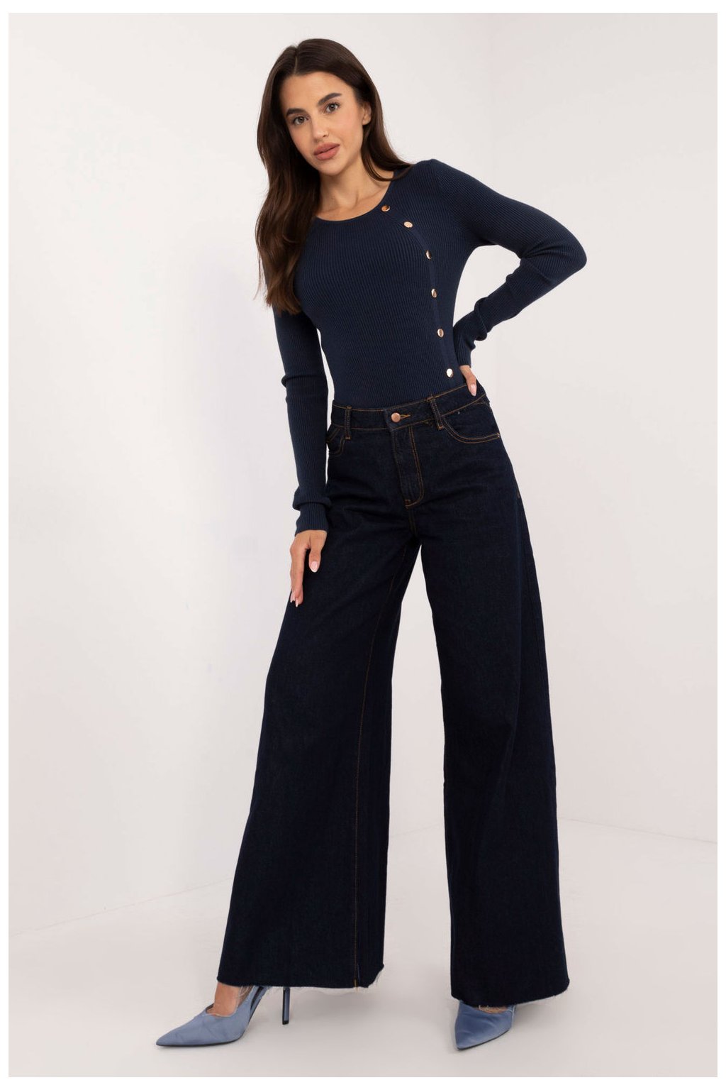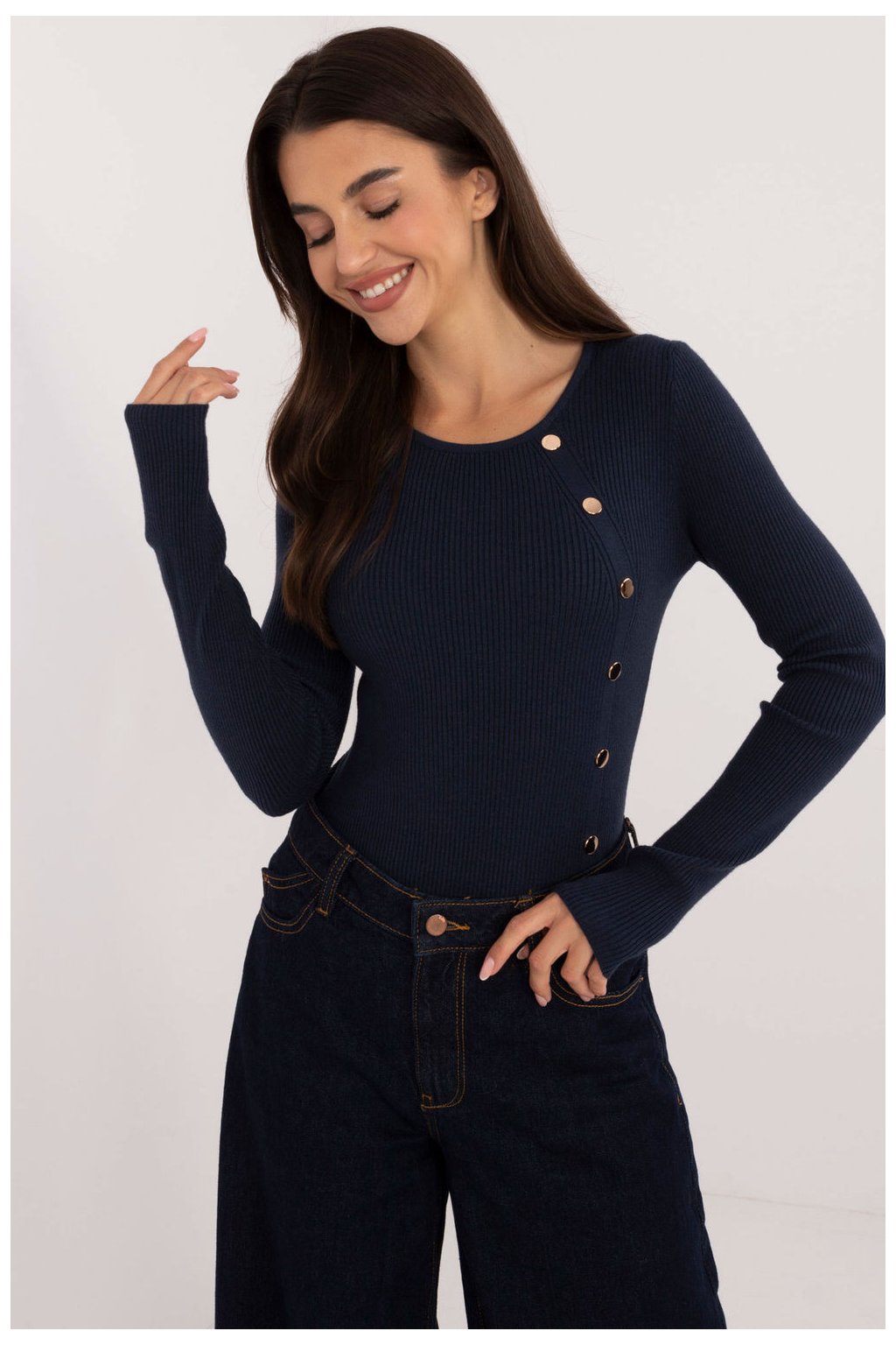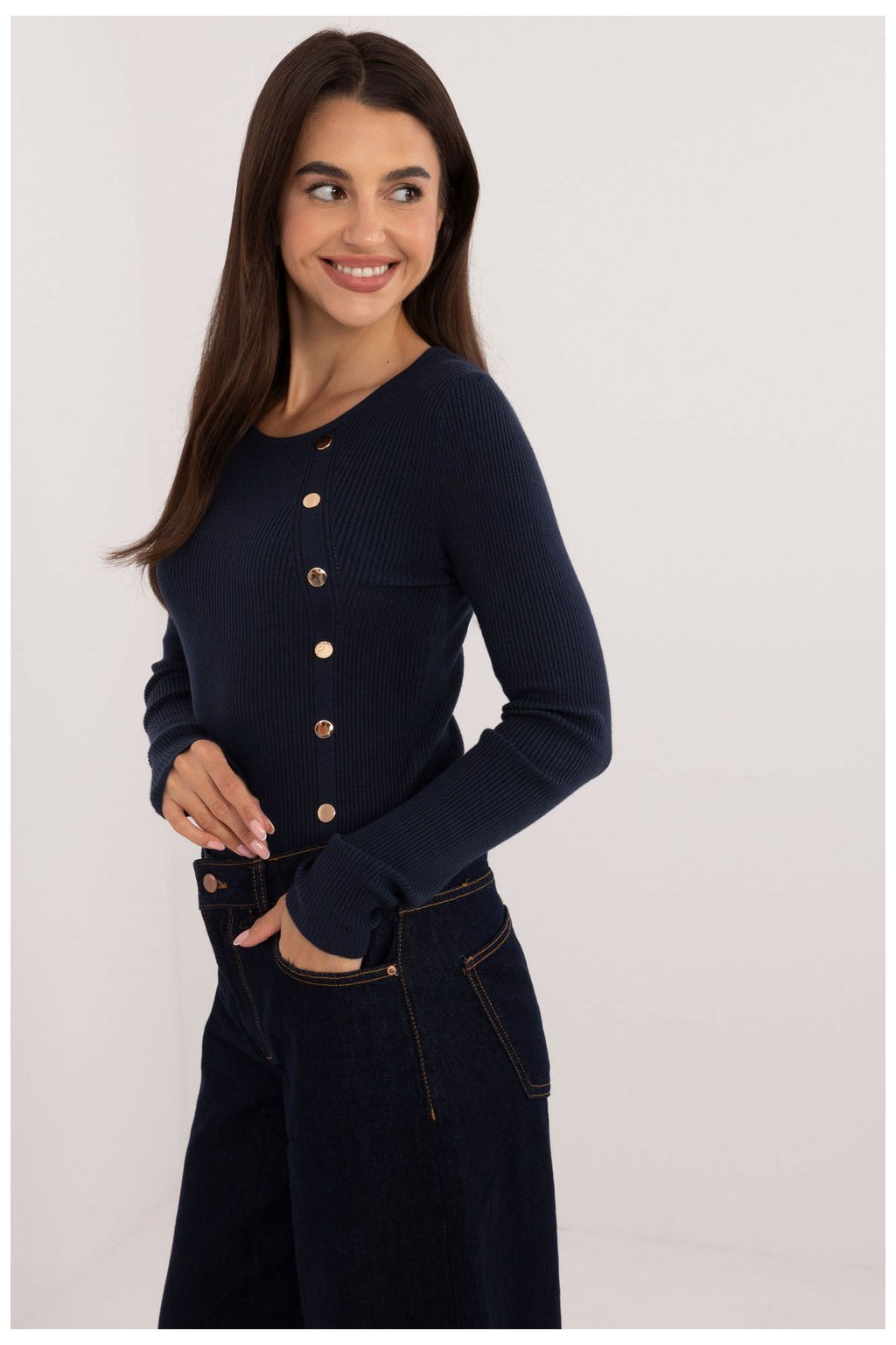 Ležérní dámský svetr, ideální pro každodenní nošení i do práce. Je vyroben ze směsi viskózy, polyesteru a polyamidu a poskytuje pohodlí a odolnost. Hladká žebrovaná tkanina podtrhuje jemný, klasický charakter svetru, který má standardní délku a dlouhé rukávy. Kulatý výstřih dodává svetru univerzálnost, zatímco ozdobné knoflíky na přední straně, které se táhnou po celé délce svetru, mu dodávají stylový a elegantní nádech. Je to skvělá volba pro ležérní stylizaci, která kombinuje pohodlí s módním, ženským designem.