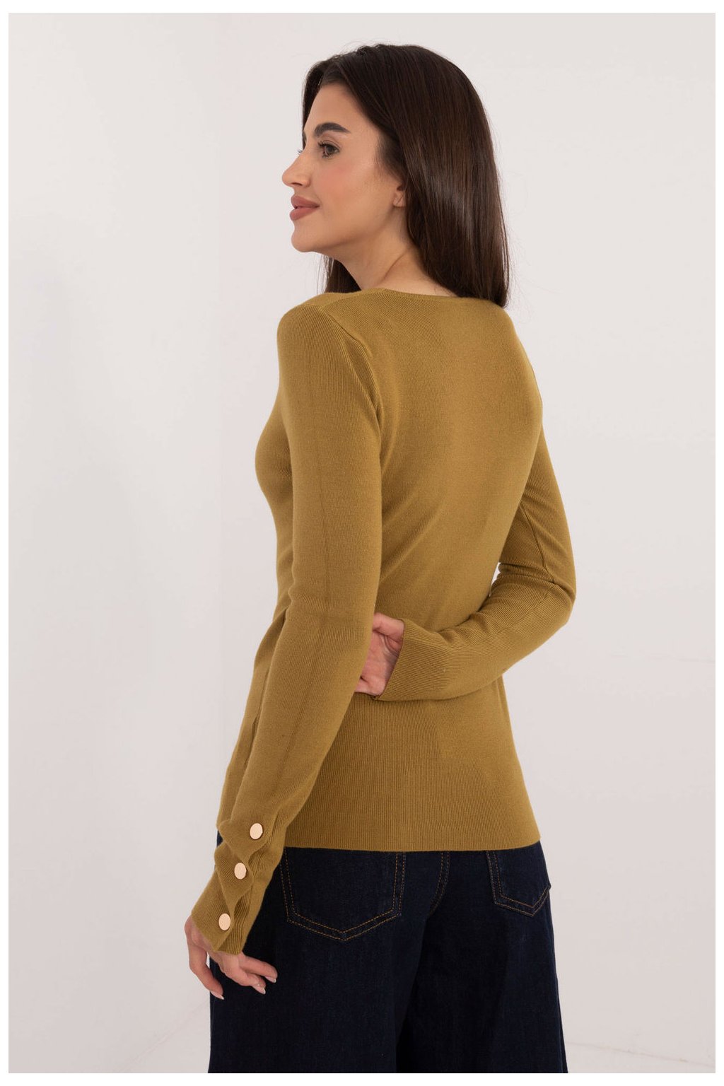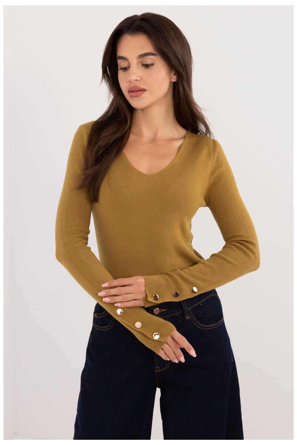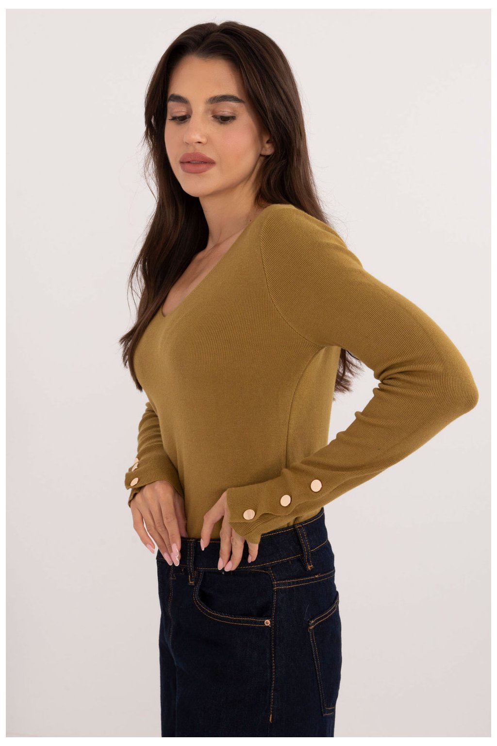 Dámský volný svetr je ideální pro každodenní nošení i do práce. Vyrobený z vysoce kvalitní směsi materiálů: viskózy, polyamidu a polyesteru, zajistí pohodlí a odolnost. Hladký vzor a klasická délka dělají z tohoto svetru univerzální kousek do šatníku. Svetr má dlouhý rukáv s ozdobnými knoflíky u zápěstí, které dodávají jemný elegantní akcent. Výstřih ve tvaru písmene V zdůrazní krk a dodá celkově ženský charakter. Skvělá volba pro kancelář i každodenní nošení.