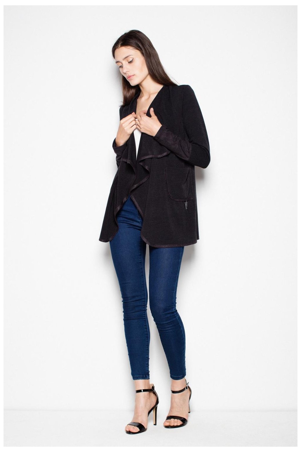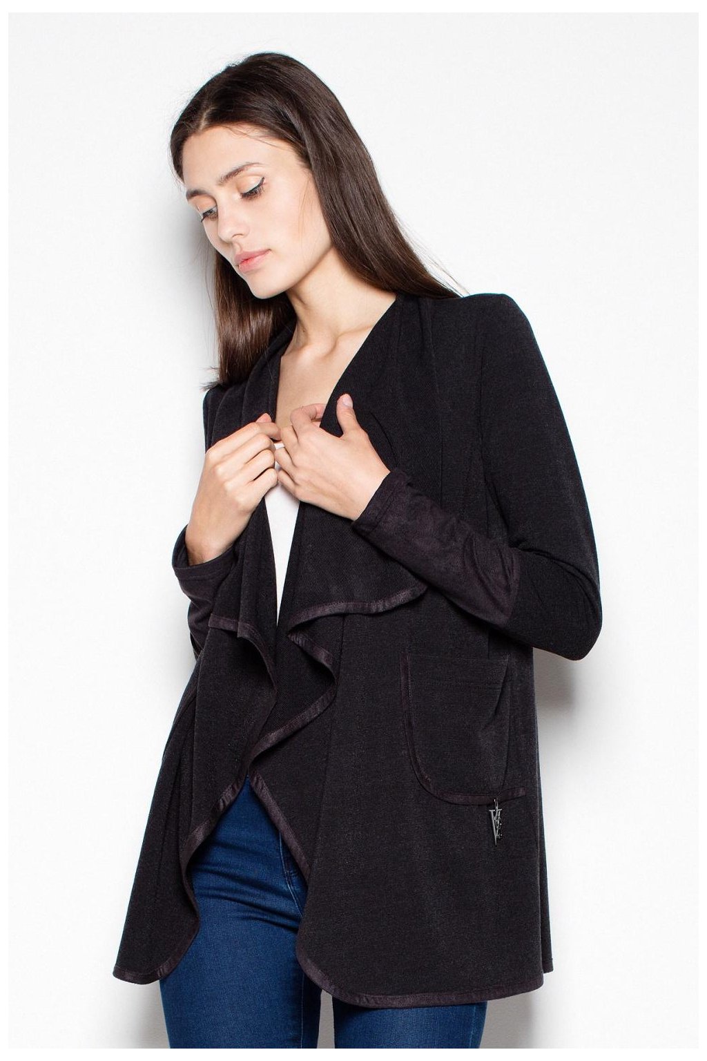 Elegantní dámský svetr bez knoflíků s vycpaným límcem. Rukávy jsou zakončeny kontrastní barvou. Kapsy na bocích. Svetr je zakončen kontrastním lemováním.