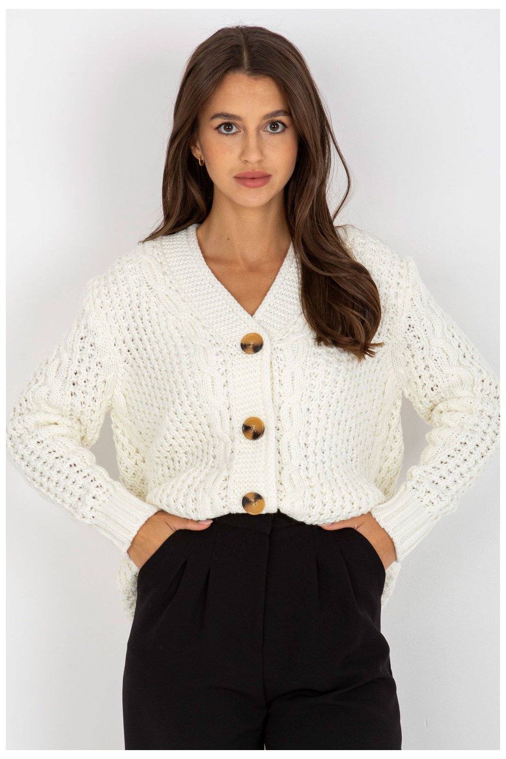 Dámský svetr s dlouhými rukávy, zapínáním na knoflíky a výstřihem.