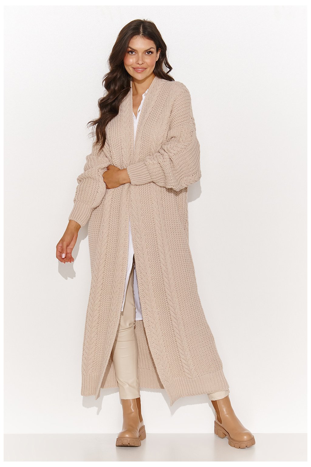 Tento dlouhý dámský svetr je naprostou nezbytností pro chladnější dny. Jeho otevřený střih a široké rukávy zakončené žebrovanými manžetami zajišťují pohodlí a volnost pohybu. Jemná kostkovaná vazba mu dodává na půvabu a jedinečnosti, takže je ideální volbou pro ženy, které ocení originální a elegantní detaily. Nepochybně se stane vaším oblíbeným kouskem šatníku během chladnějších dnů. Svetr se dodává v několika atraktivních barvách: cappuccino, černá, medová, nude a ocelová. Oblečte si ho k džínám a kozačkám a získejte ležérní, ale stylový každodenní vzhled. Nebo ho kombinujte s elegantními kalhotami a jehlovými podpatky pro formálnější příležitosti. Ať už ji budete nosit jakkoli, určitě si ji zamilujete!