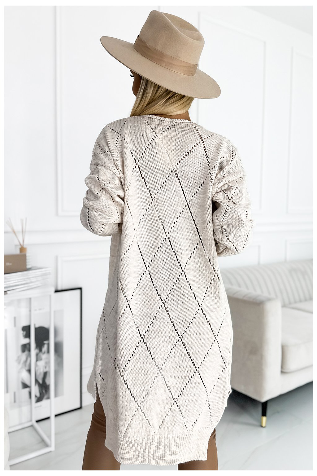 Teplý svetr s prodlouženým zadním dílem. Je vyroben z prolamovaného svetru v béžové barvě. Značka numoco basic. Evropská výroba.
