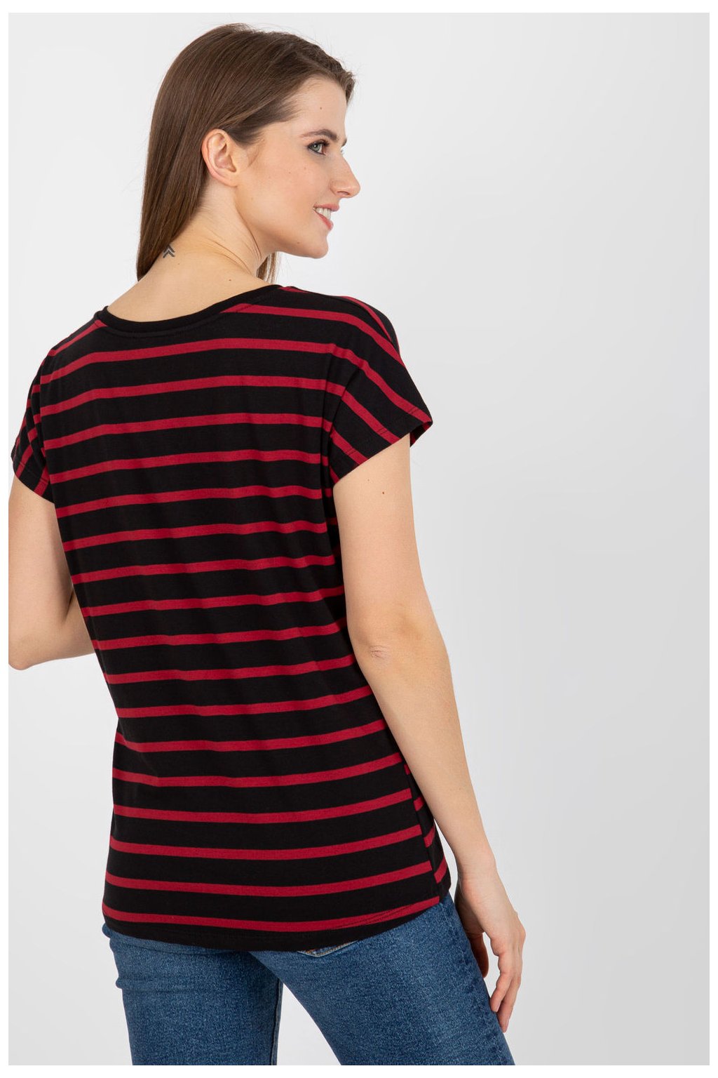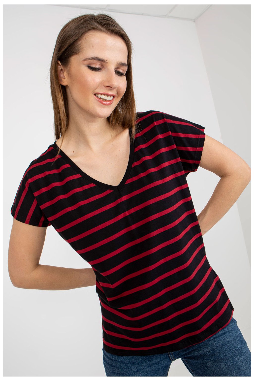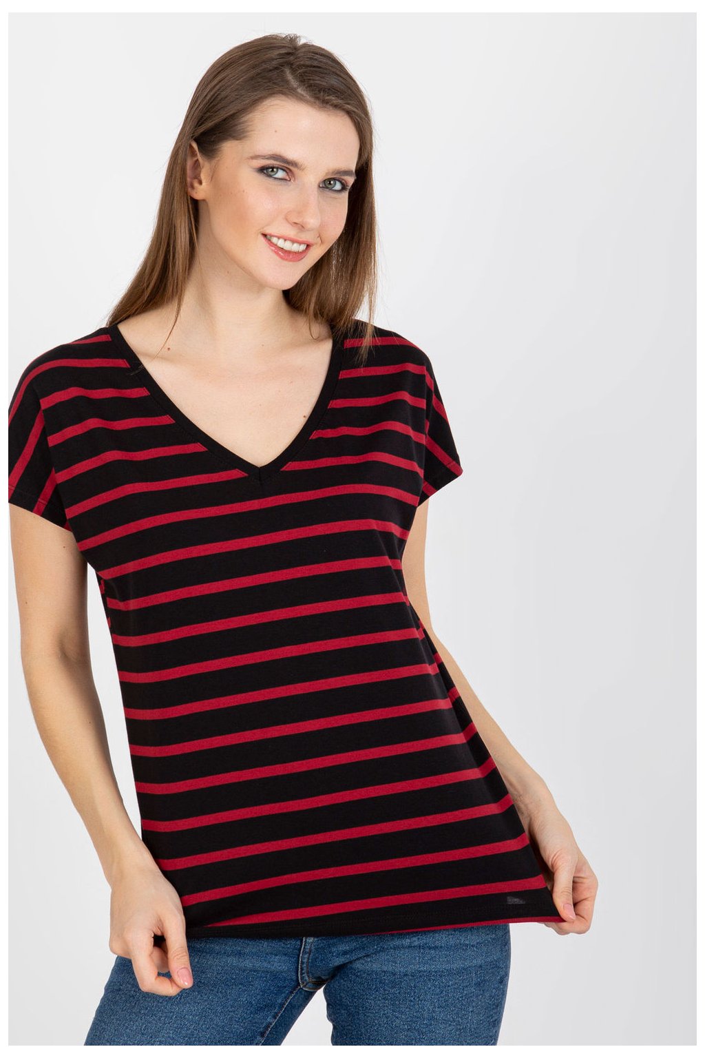 Dámské tričko s krátkým rukávem a výstřihem. Tričko z pruhované látky.