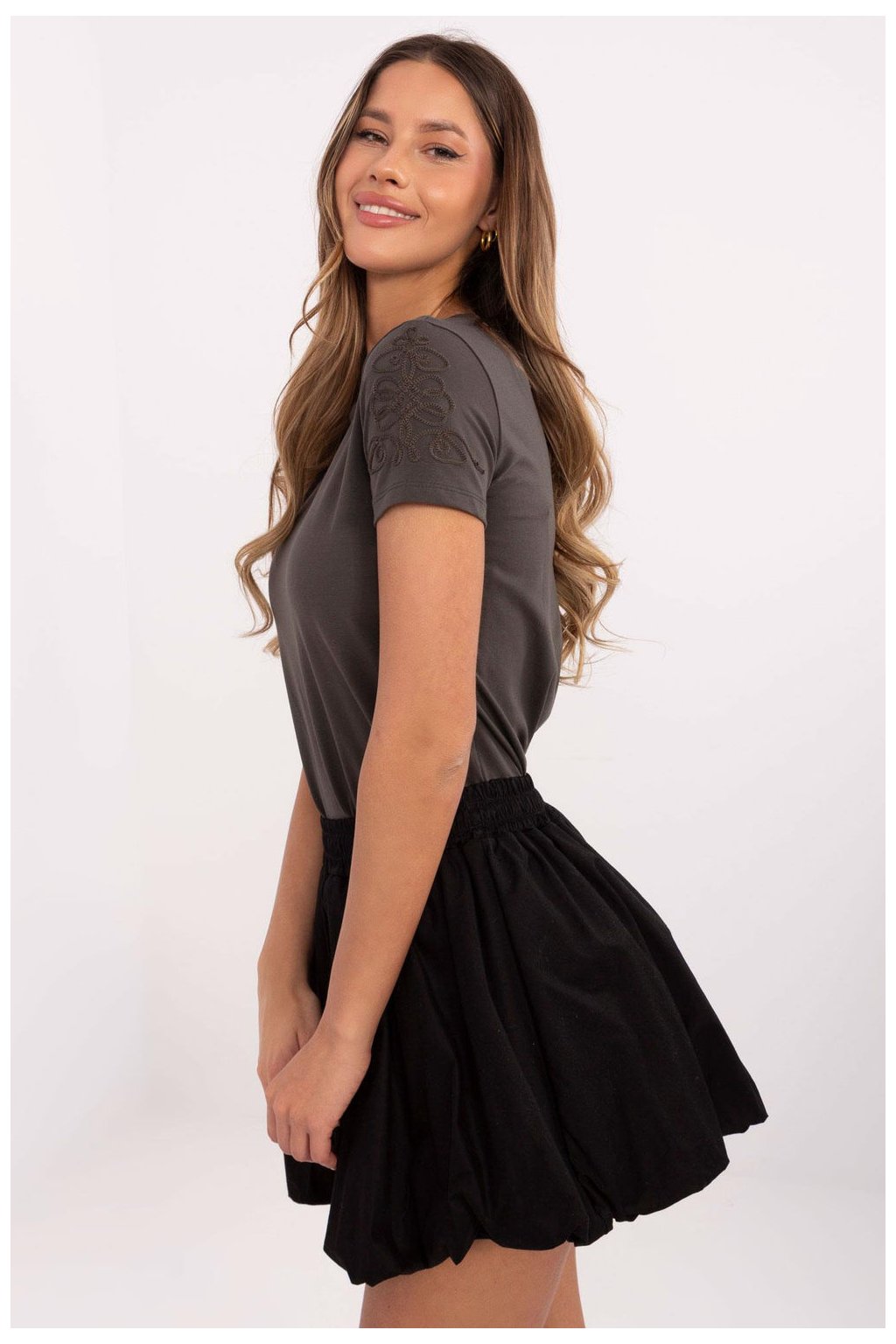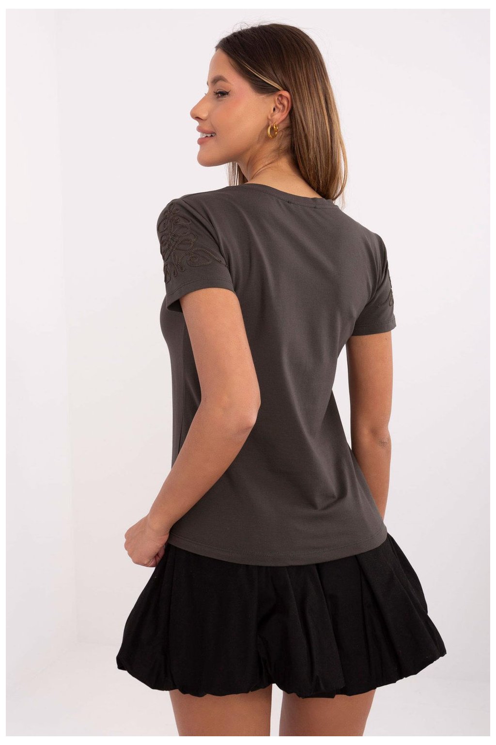 Dámské tričko v casual stylu, ideální na každý den. Vyrobeno z měkké směsi bavlny a elastanu, poskytuje pohodlí a pružnost, přizpůsobující se postavě. Hladký materiál zdůrazňuje jednoduchost a univerzálnost modelu. Krátké rukávy a kulatý výstřih vytvářejí klasický střih, který se hodí k mnoha stylizacím. Ozdobný výšivky na rukávech přidává tričku decentní, ale originální akcent, dodávající mu výjimečný charakter. Ideální volba pro každodenní, casual outfity.