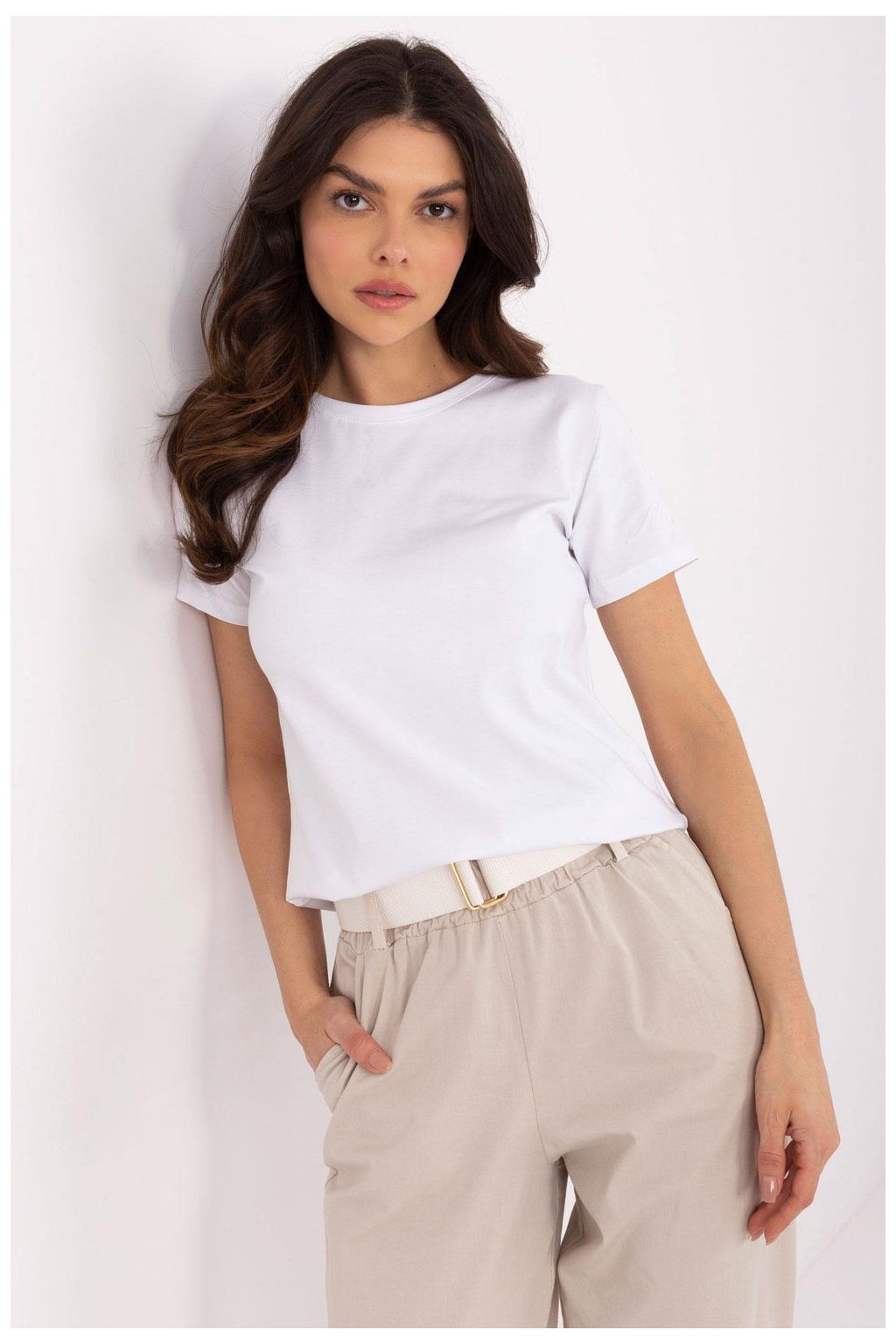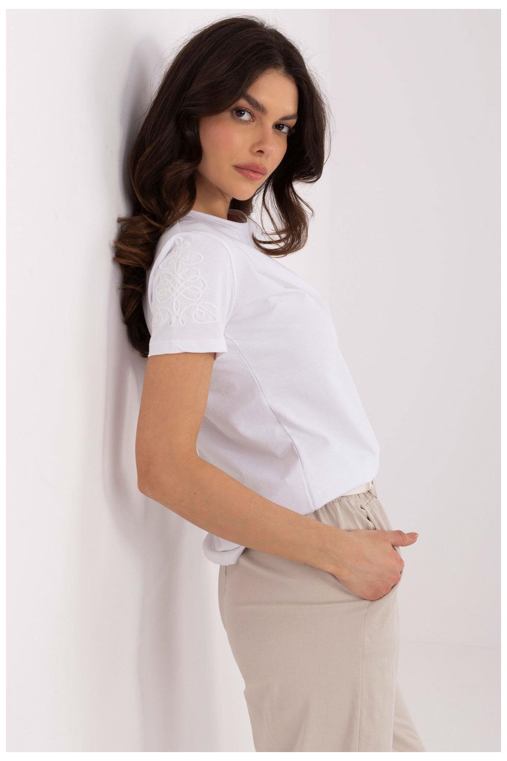 Dámské triko v casual stylu, ideální na každý den. Vyrobeno z měkké směsi bavlny a elastanu, poskytuje pohodlí a pružnost, přizpůsobuje se postavě. Hladký materiál zdůrazňuje jednoduchost a univerzálnost modelu. Krátké rukávy a kulatý výstřih tvoří klasický střih, který se hodí k mnoha stylizacím. Ozdobný vyšívání na rukávech přidává triku jemný, ale originální akcent, dodávající mu výjimečný charakter. Ideální volba pro každodenní, casual outfity.