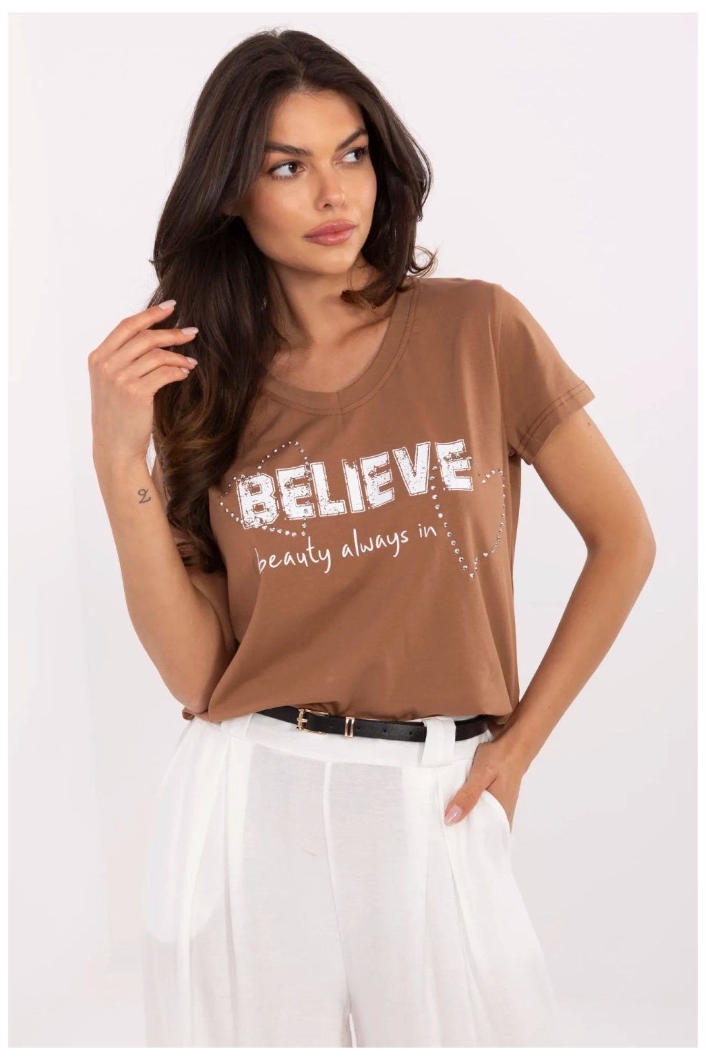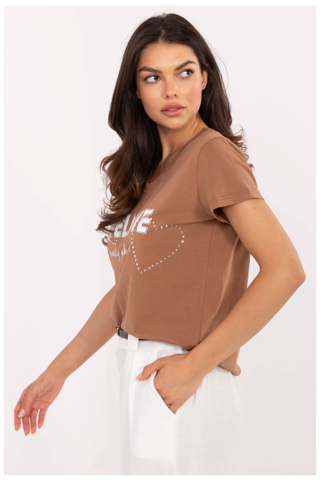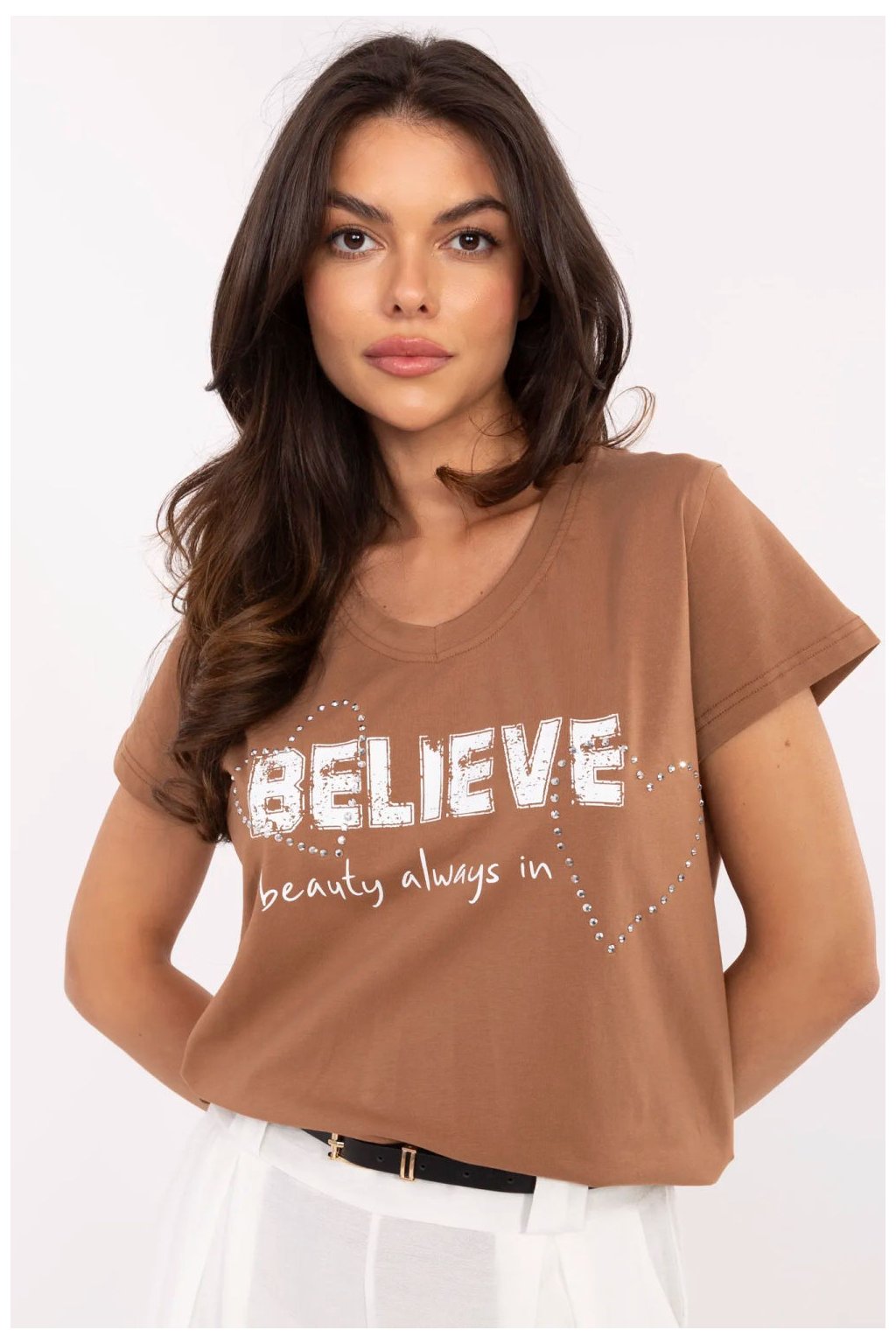 Dámské triko v casual stylu je ideální volbou pro každodenní outfit s nádechem lesku. Vyrobeno z měkké a elastické směsi bavlny a elastanu, poskytuje pohodlí a skvělé přizpůsobení postavě. Model s standardní délkou, krátkým rukávem a ženským výstřihem do srdce. Na přední straně je působivý potisk s aplikací, zdobený jemnými zirkony, které tričku dodávají výjimečný charakter a jemný lesk. Toto triko je spojením pohodlí a stylu, skvělou volbou na každý den, která snadno zpestří každý casual outfit.