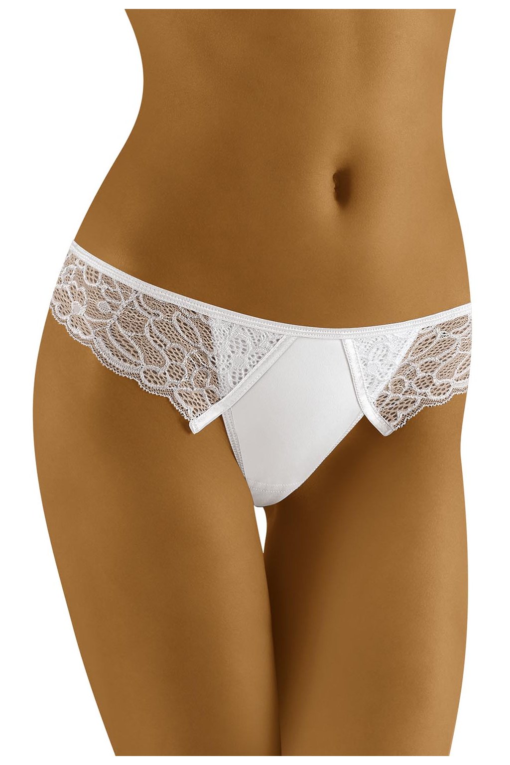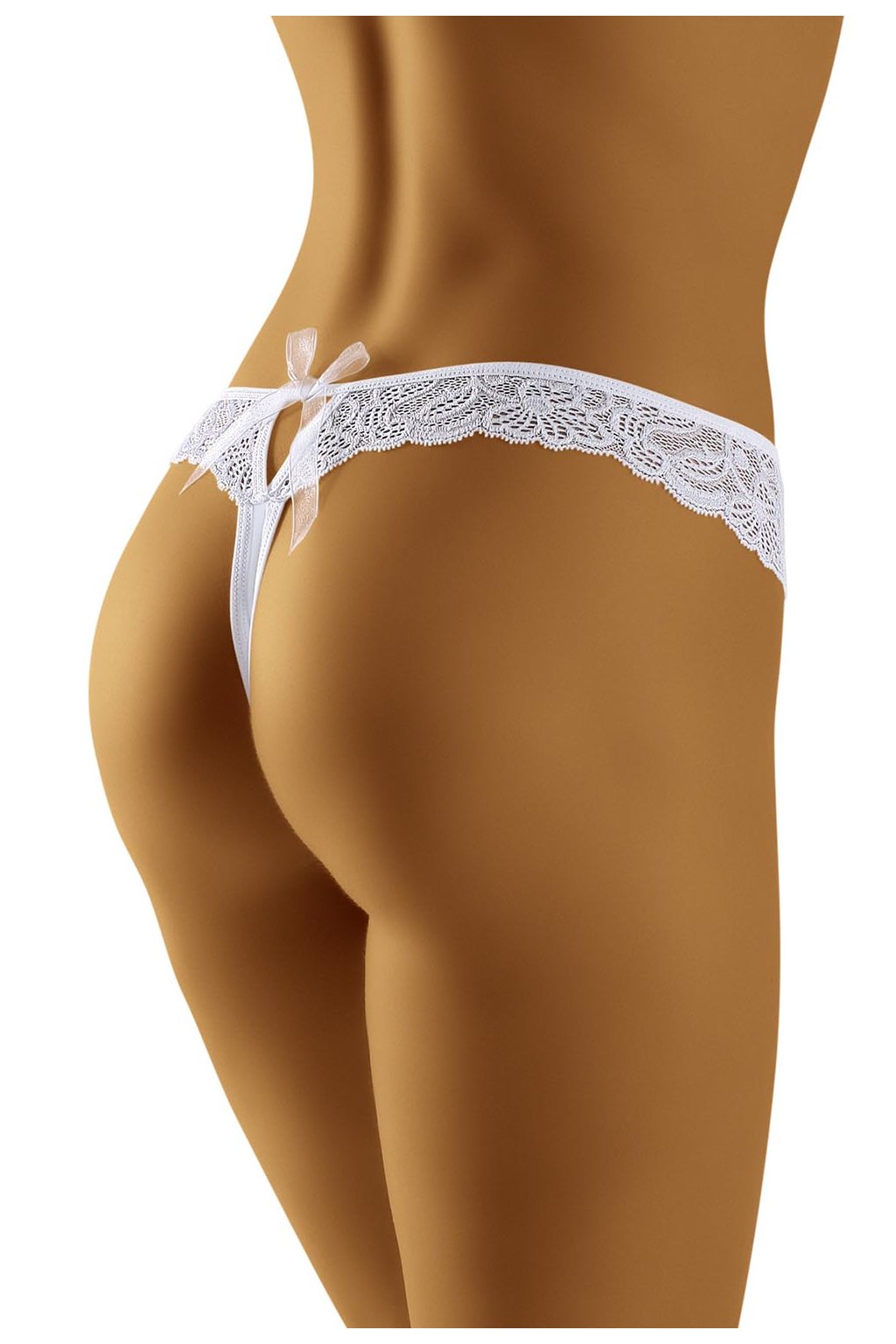Sexy krajková tanga pro dámy, které ocení eleganci a pohodlí. Krásná záda přitahují pozornost...všech!!! Boky a záda z příjemné, na těle se třpytící krajky. Na zadní straně mašle a lesklý lem.