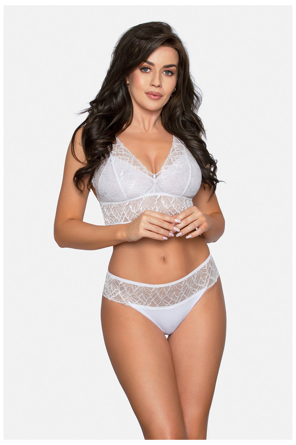 Smyslné kalhotky typu tanga s běžným topem. Vzorovaná krajka obepíná tělo a dokonale se přizpůsobuje siluetě. Silně vykrojený střih zdůrazňuje tvar hýždí a stehen.