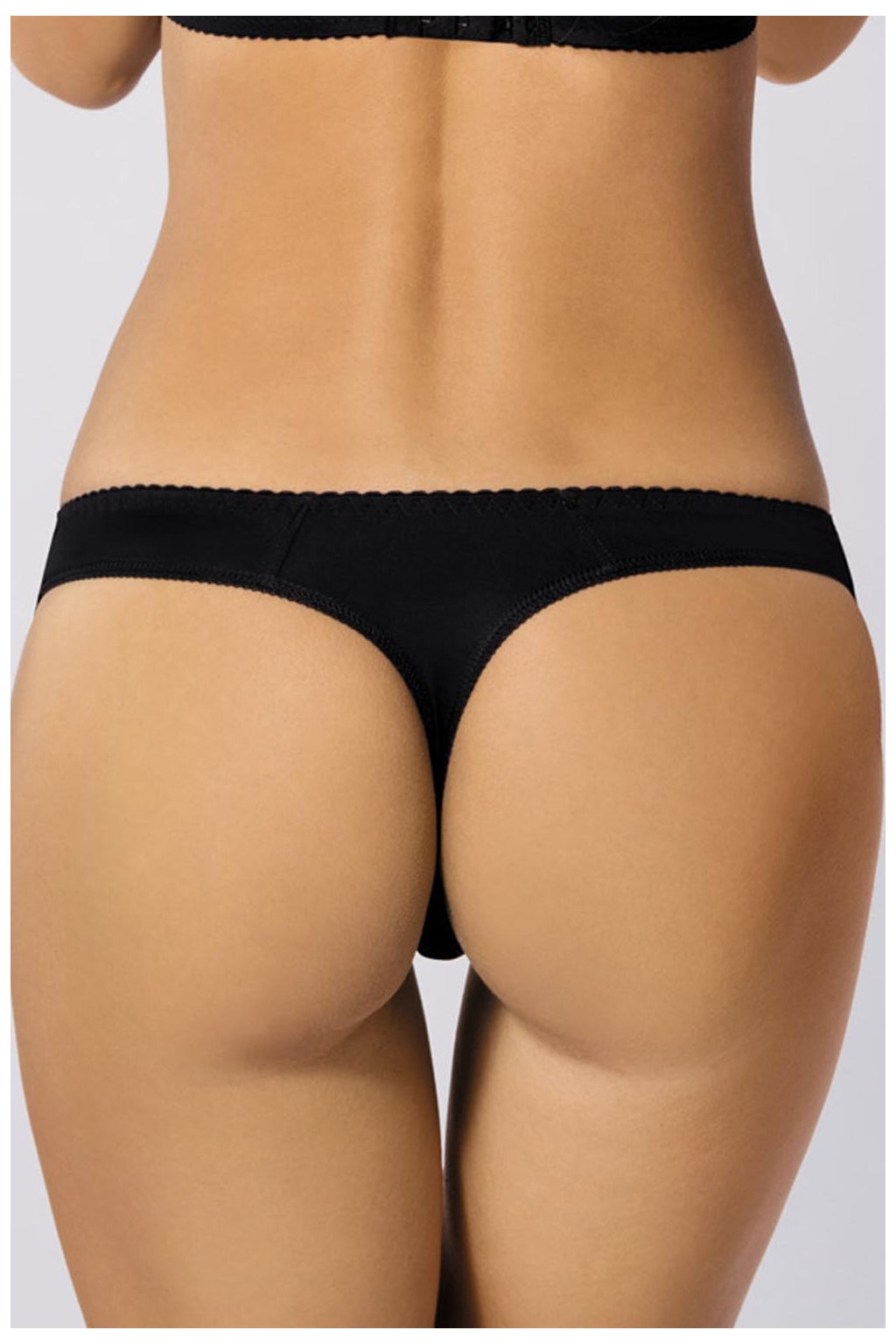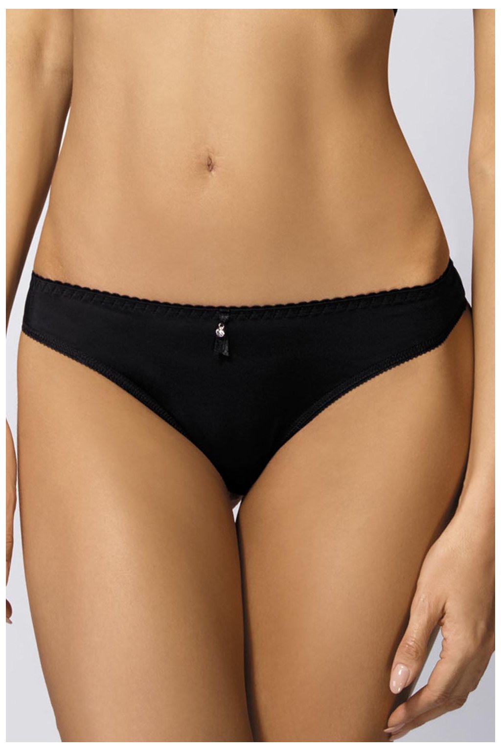 Klasická tanga z hladkého úpletu. Jemná stuha s ozdobou umístěná na přední straně dodává prádlu šarm.