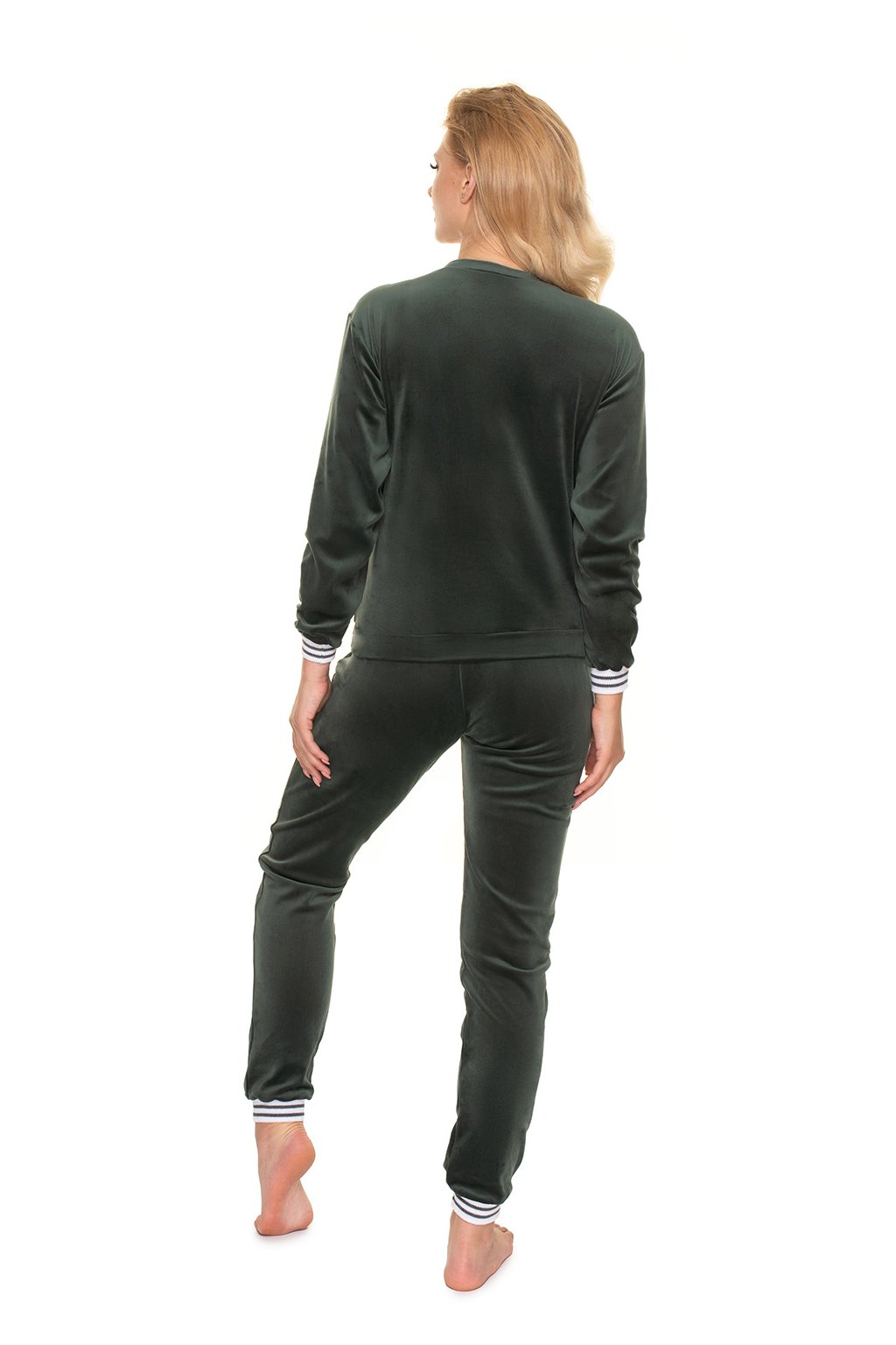 Tepláková souprava s kontrastním lemováním. Halenka s kulatým výstřihem. Mikina je vyrobena z měkké velurové tkaniny. Kalhoty s netlačícím páskem.