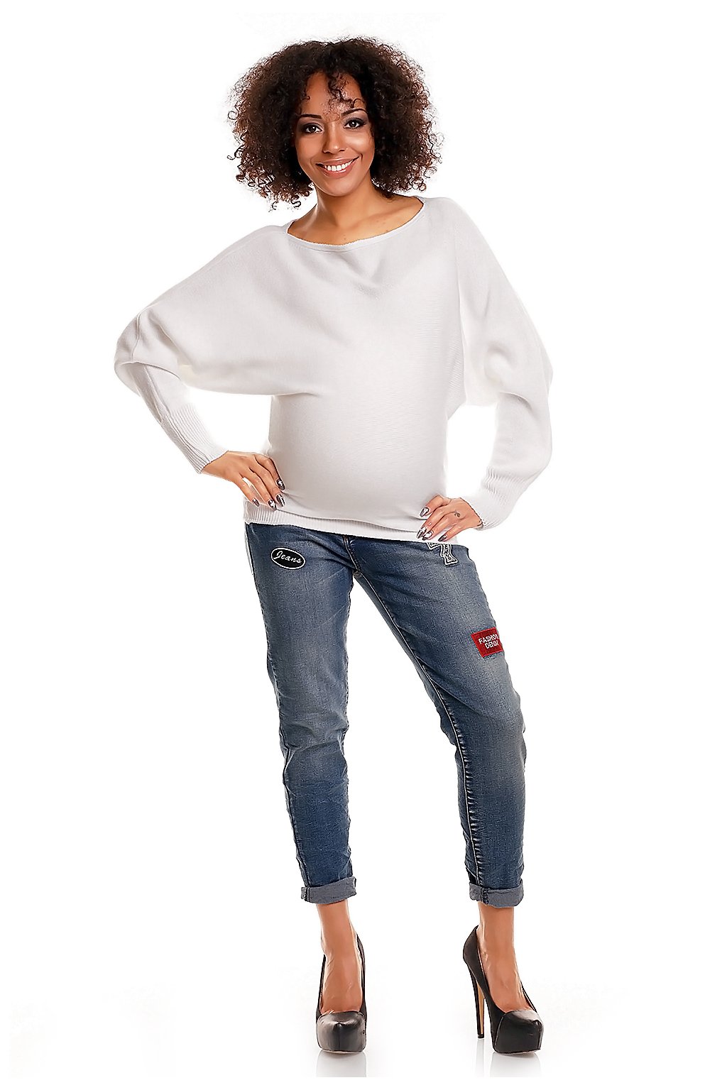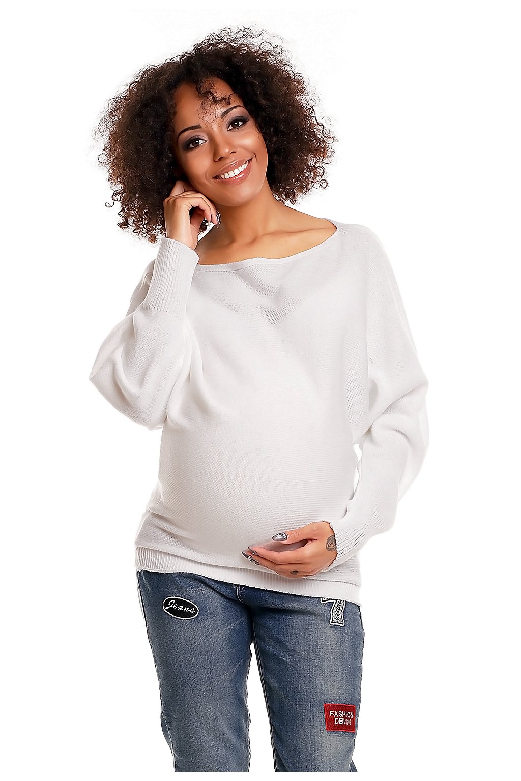 Krátký těhotenský svetr nadměrné velikosti. Spodní část a rukávy jsou zakončeny žebrováním. Lodičkový výstřih, dlouhé rukávy. Kimonový střih maskuje rostoucí břicho. Široký výstřih umožňuje koketně odhalit rameno. Svetr z měkké a na nošení příjemné příze s jemnou vazbou.