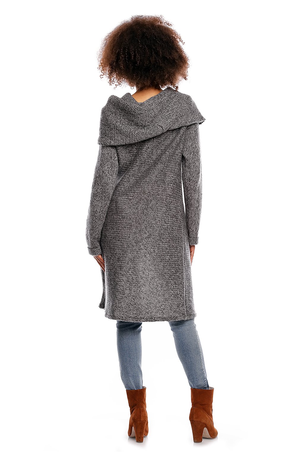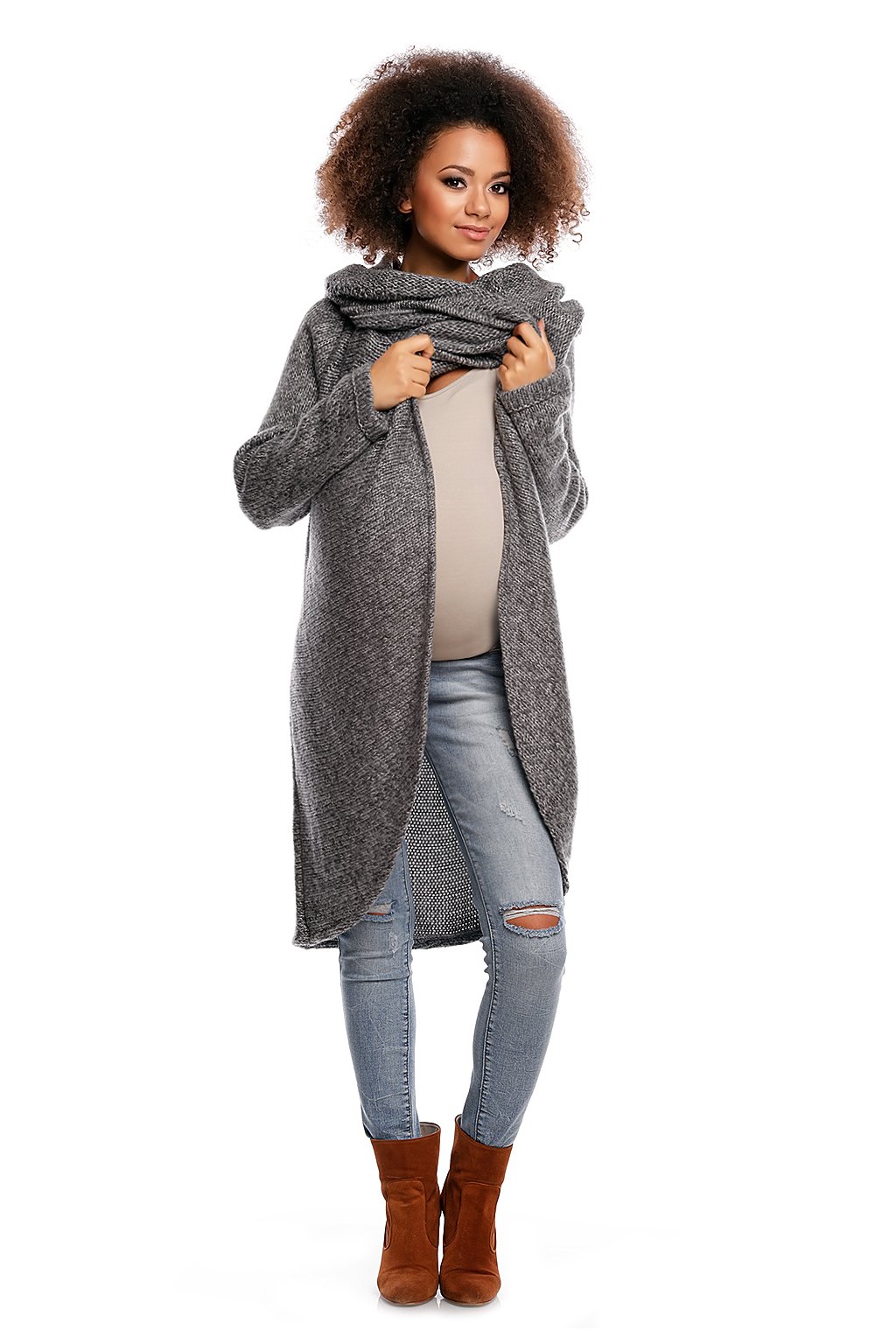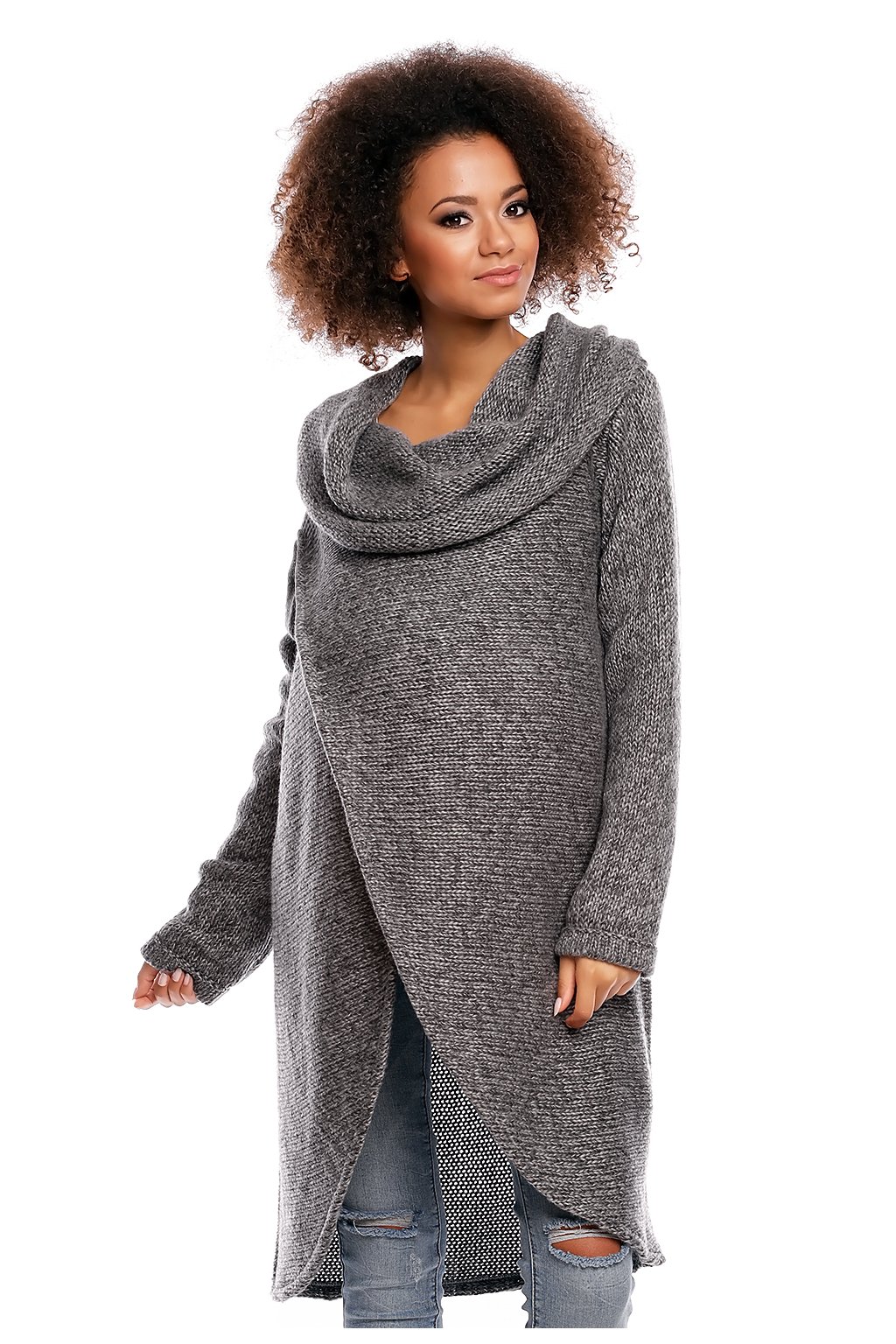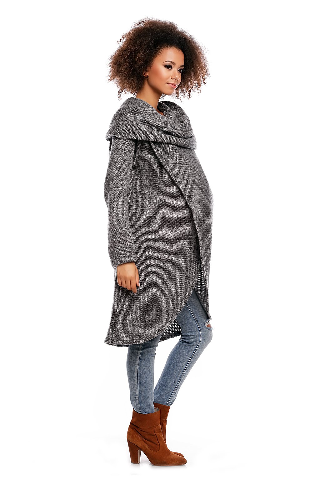 Těhotenská bunda s širokým, volným rolákem s asymetrickým, překrývajícím se předním dílem. Elegantní a jedinečný návrh pro budoucí maminky, které si cení pohodlí, tepla a originálního vzhledu. Svetr lze nosit samostatně nebo jako další pokrývku. Kabátek je vyroben z měkké a nadýchané příze, obléká se přes hlavu.