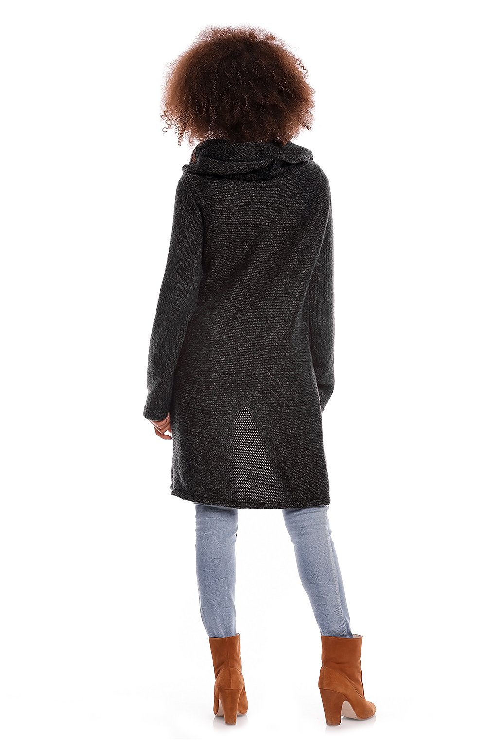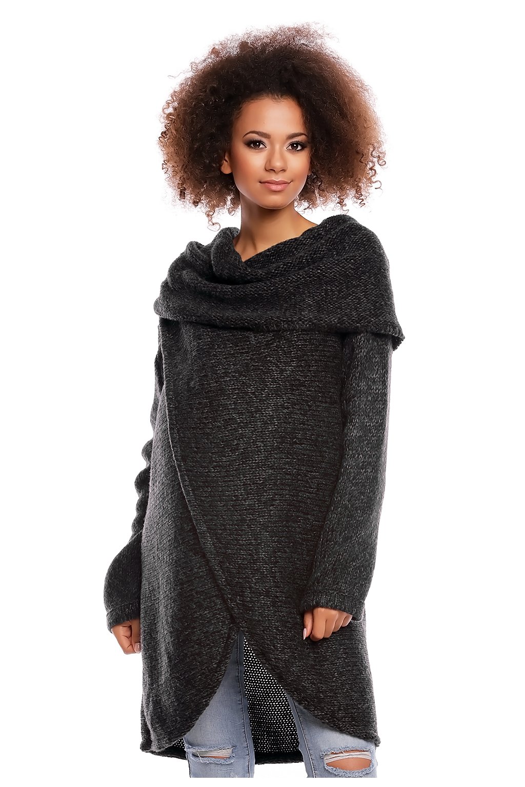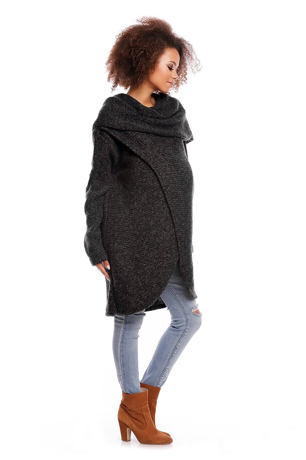Těhotenská bunda s širokým, volným rolákem s asymetrickým, překrývajícím se předním dílem. Elegantní a jedinečný návrh pro budoucí maminky, které si cení pohodlí, tepla a originálního vzhledu. Svetr lze nosit samostatně nebo jako další pokrývku. Kabátek je vyroben z měkké a nadýchané příze, obléká se přes hlavu.