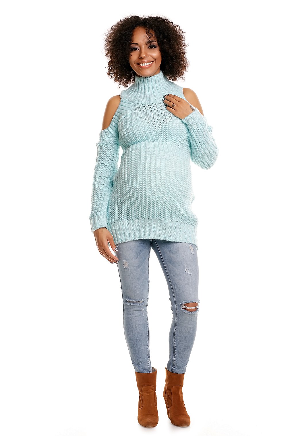 Dlouhý těhotenský svetr s polovičním zipem nahoře a širokým žebrováním dole, vyrobený z měkké, nadýchané příze z akrylu s příměsí mohéru. Originální dlouhé rukávy s koketně odhalenými rameny a příjemná příze zaručují pohodlí a módní vzhled.| Velikost | Celková délka | Vnitřní délka rukávu | Obvod prsou |