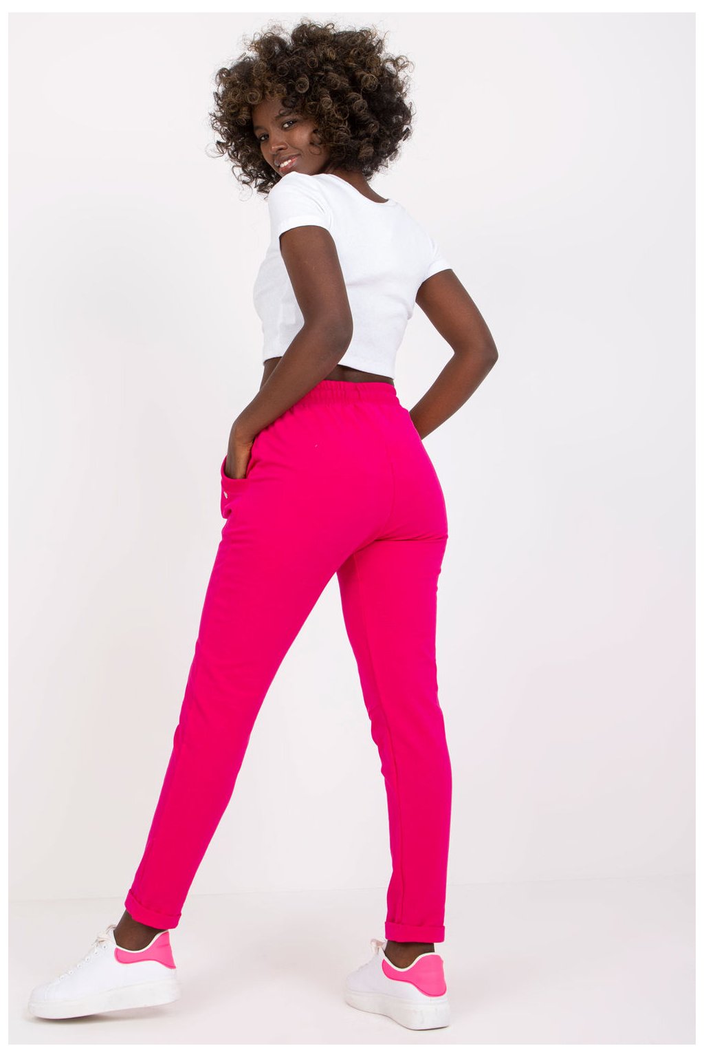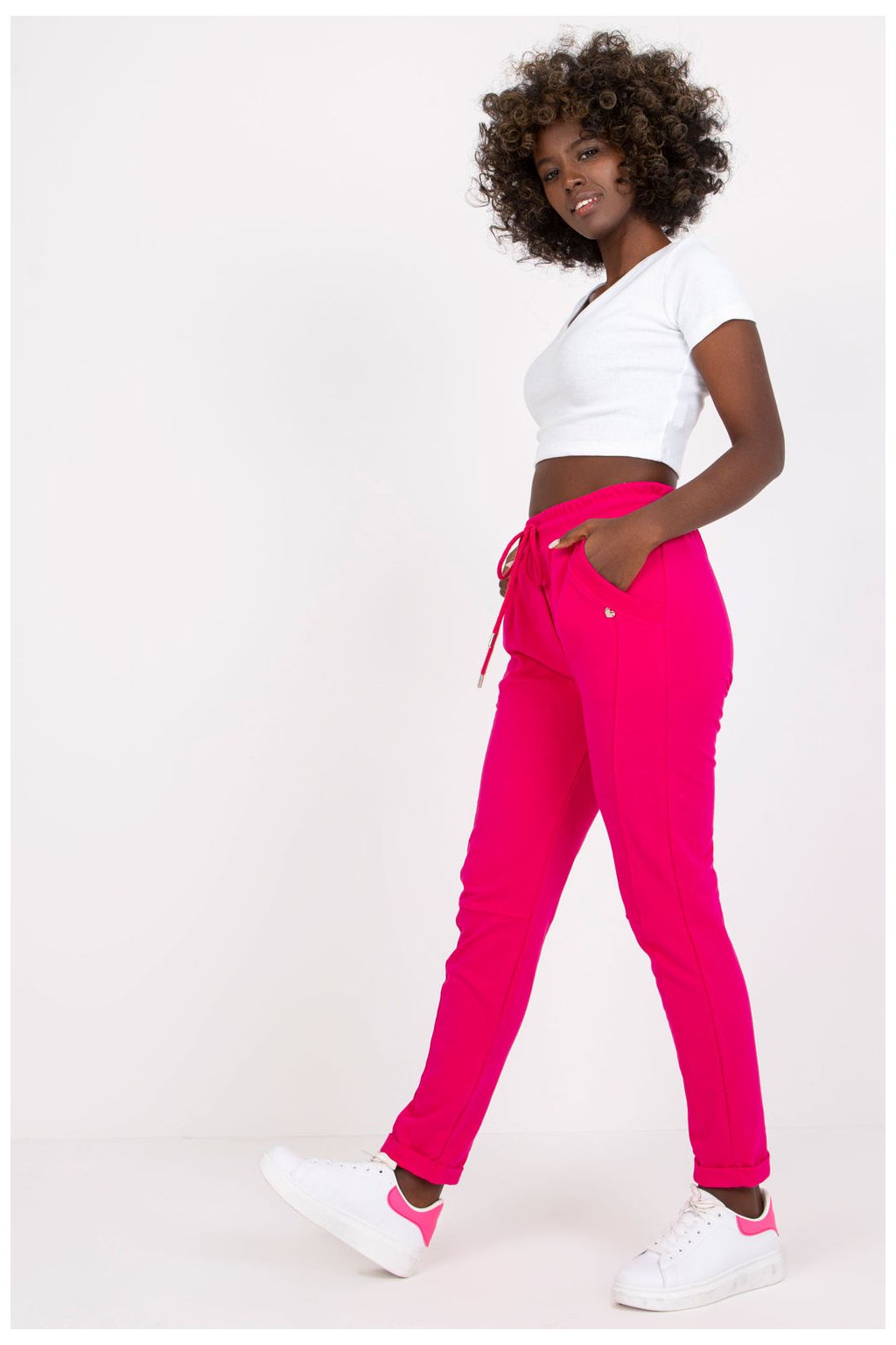Tepláky s vysokým pasem, elastickým pasem a šňůrkou na stažení. Kalhoty s kapsami na bocích. Ideální pro každodenní nošení.