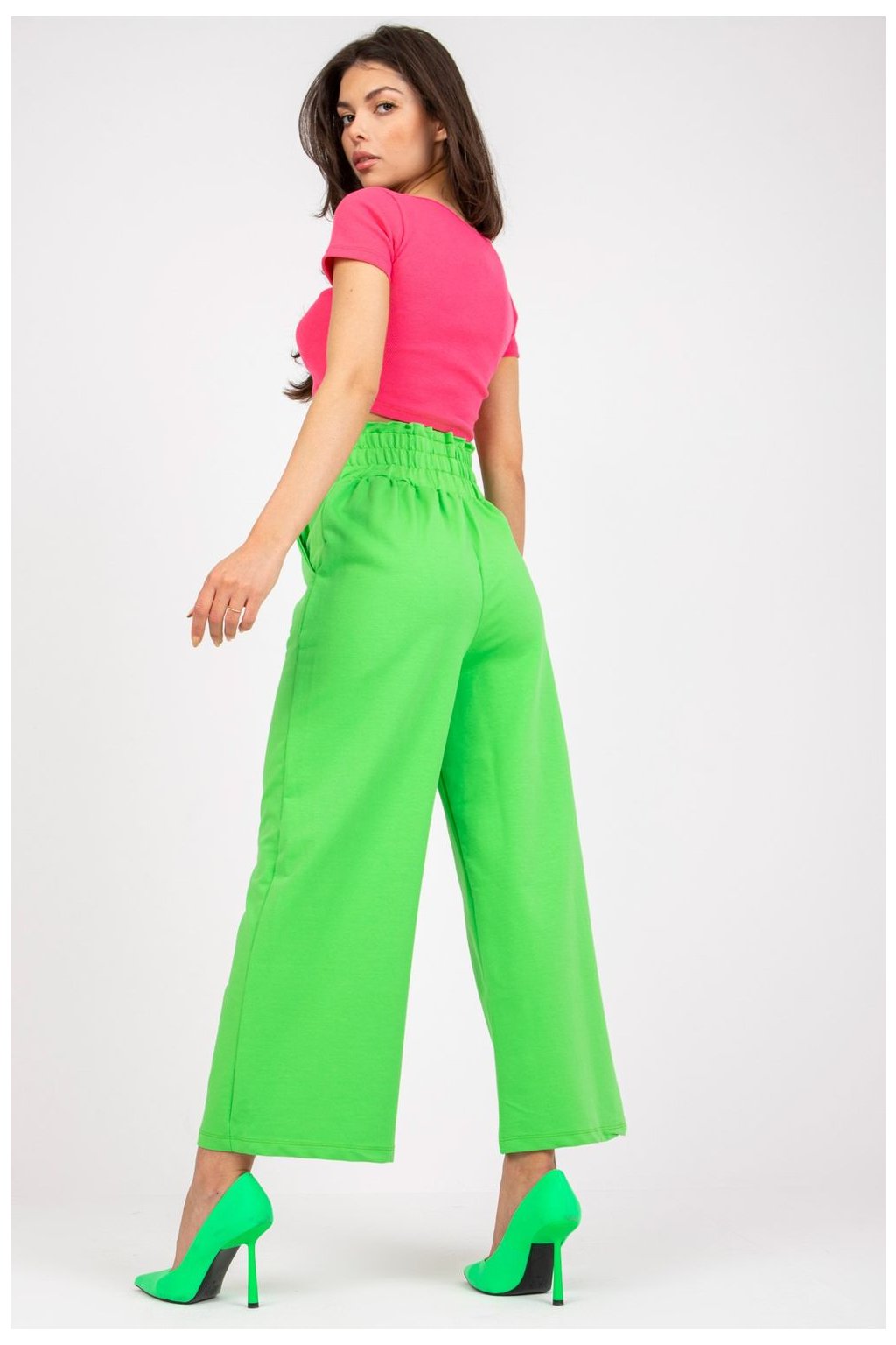 Tepláky s vysokým pasem, širokými nohavicemi a širokou gumou v pase. Kapsy na bocích.