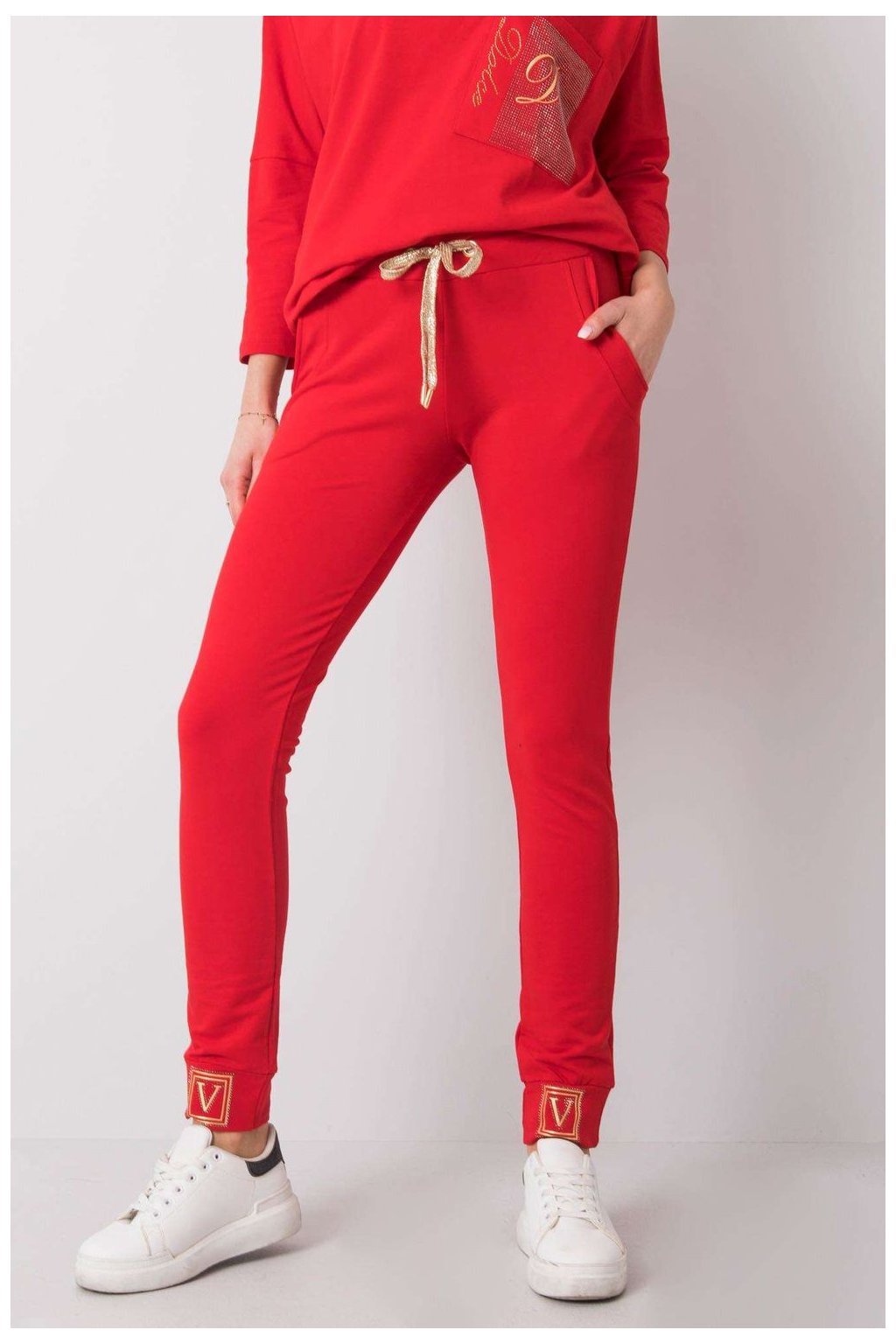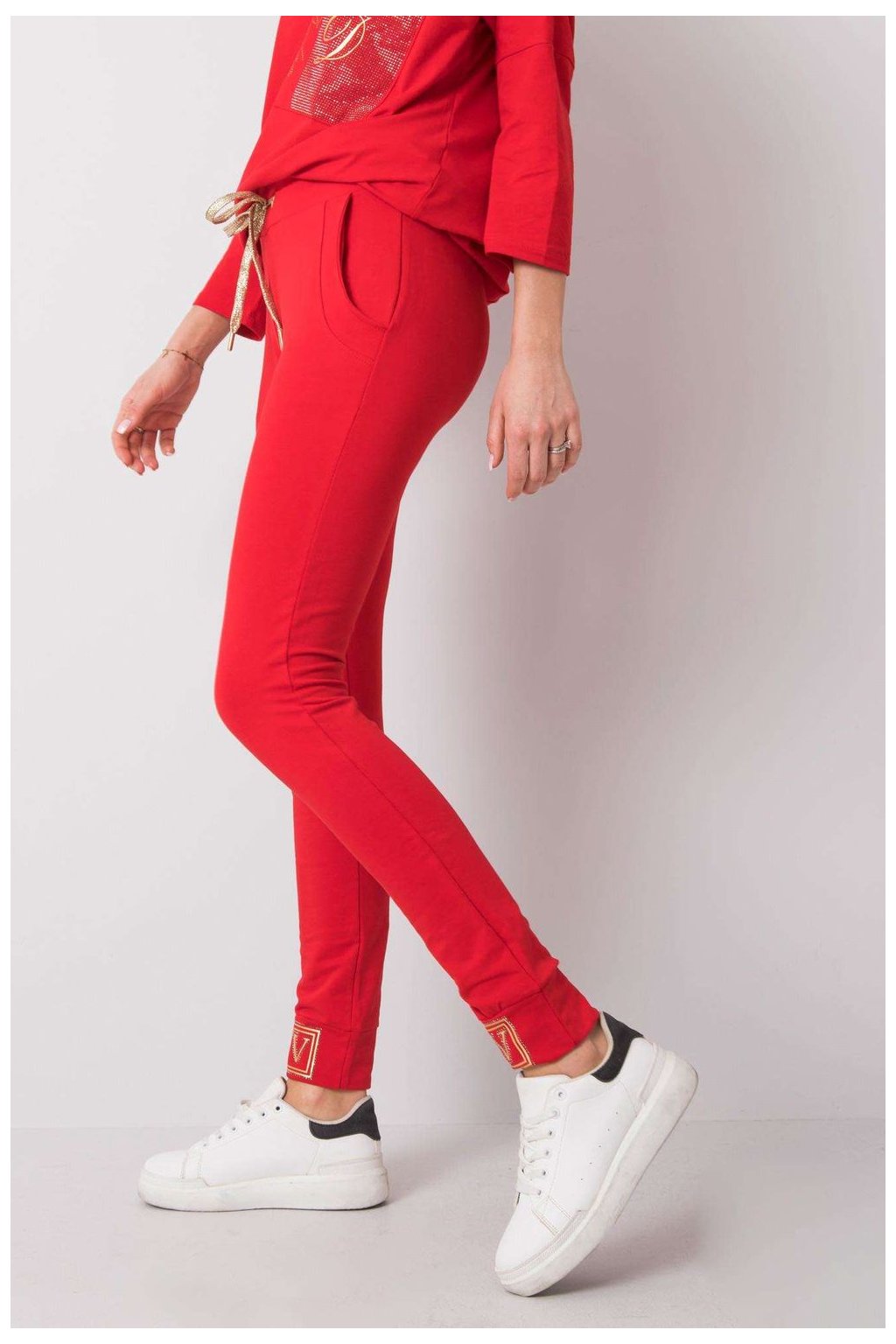 Tepláky s vysokým pasem a šňůrkou v pase. Kapsy na bocích. Ozdoby s kamínky na manžetách.